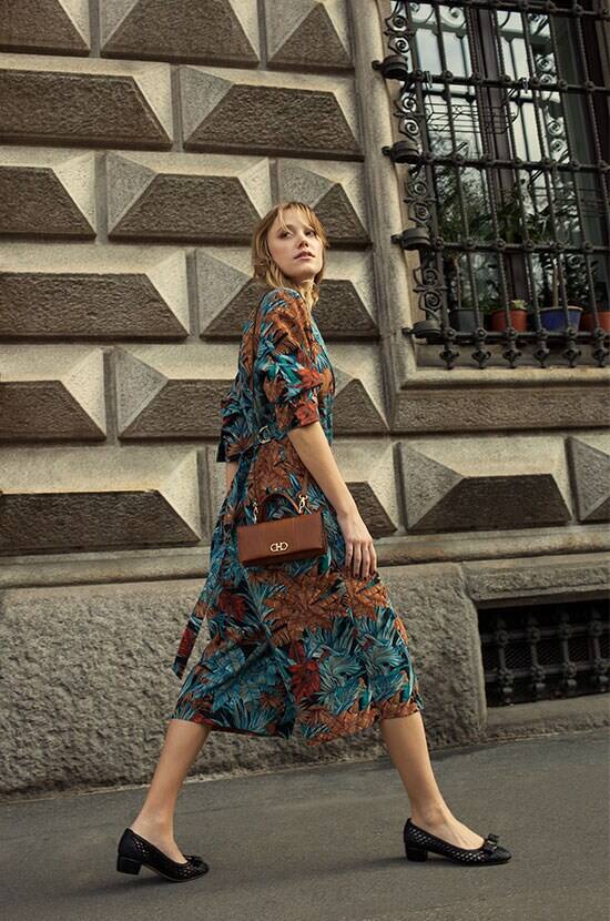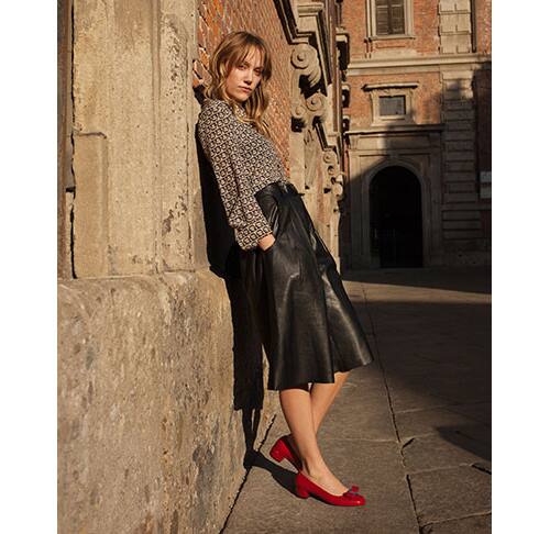 アイコニックなヴァラ・リボンが印象的なパンプス「ヴァラ」を履き、ミラノの街を行く女優マイカ・モンロー。