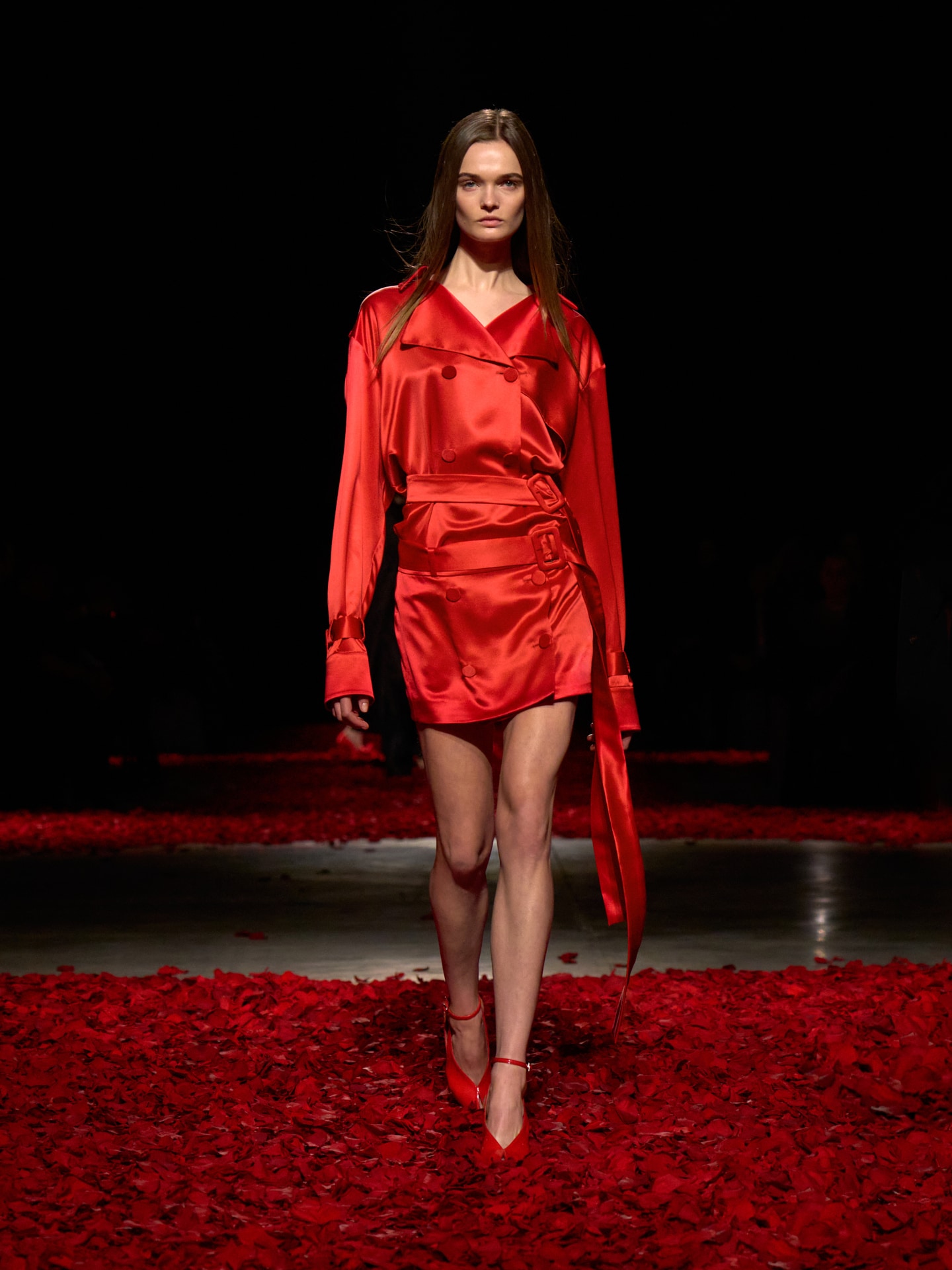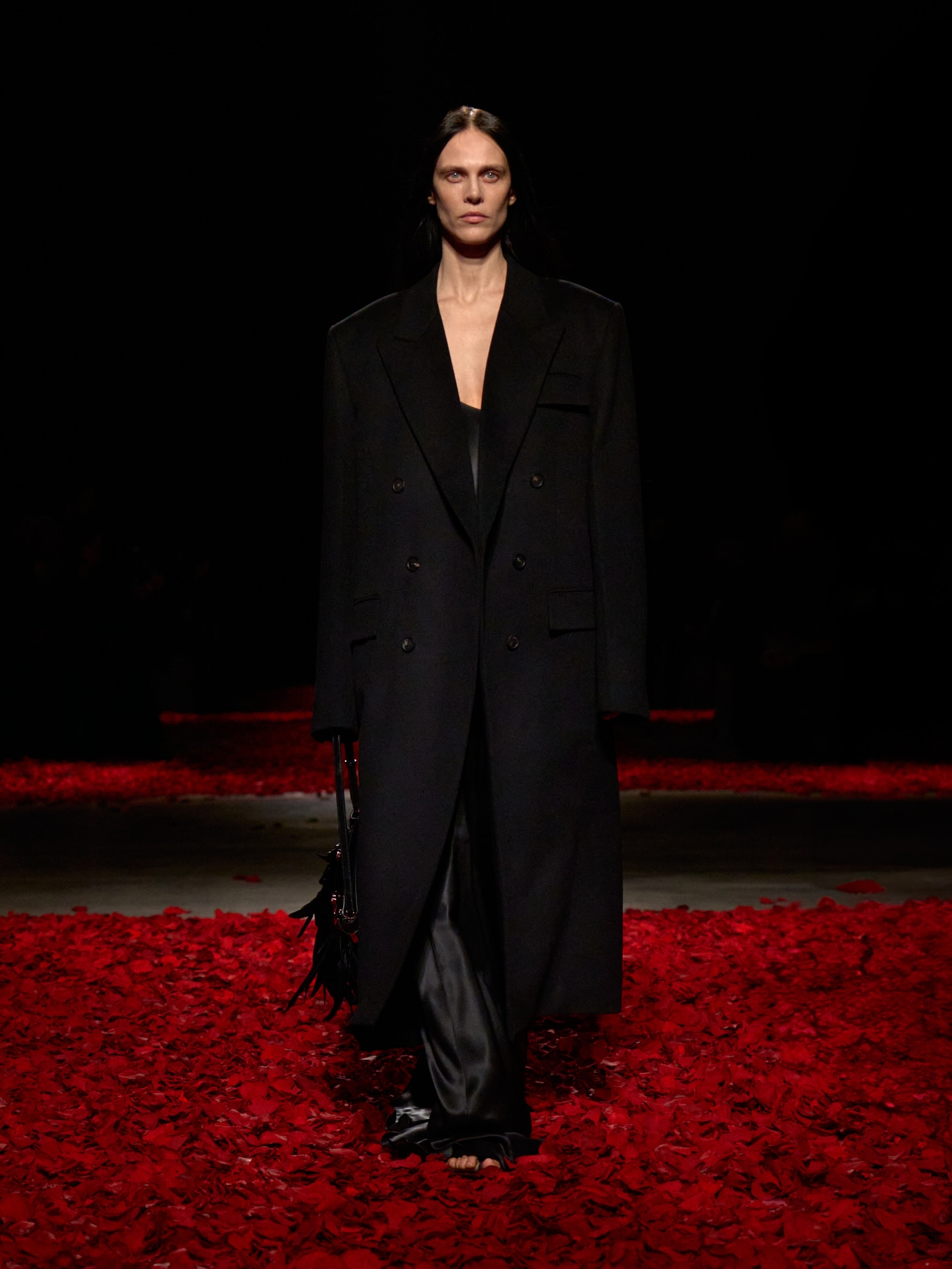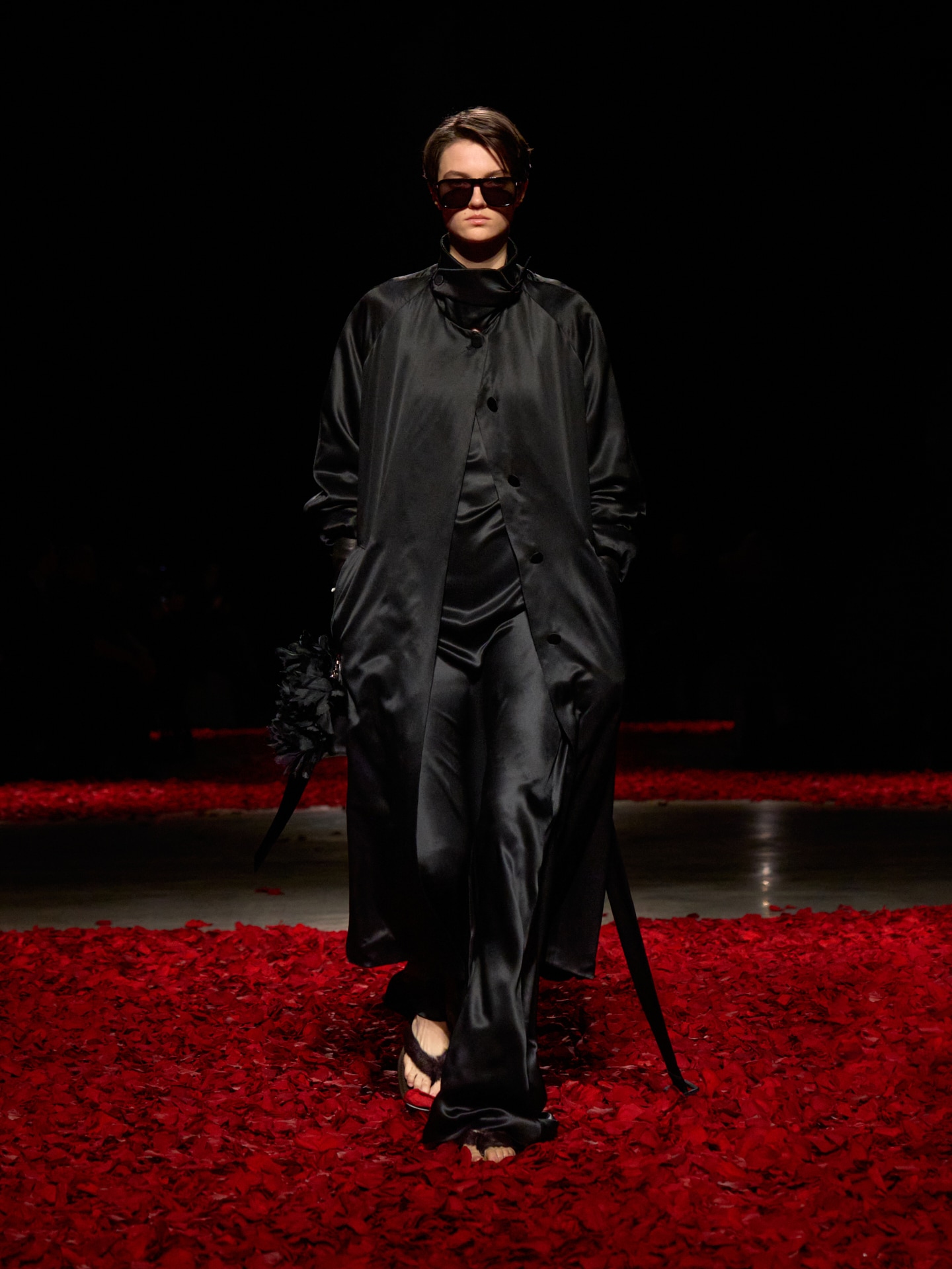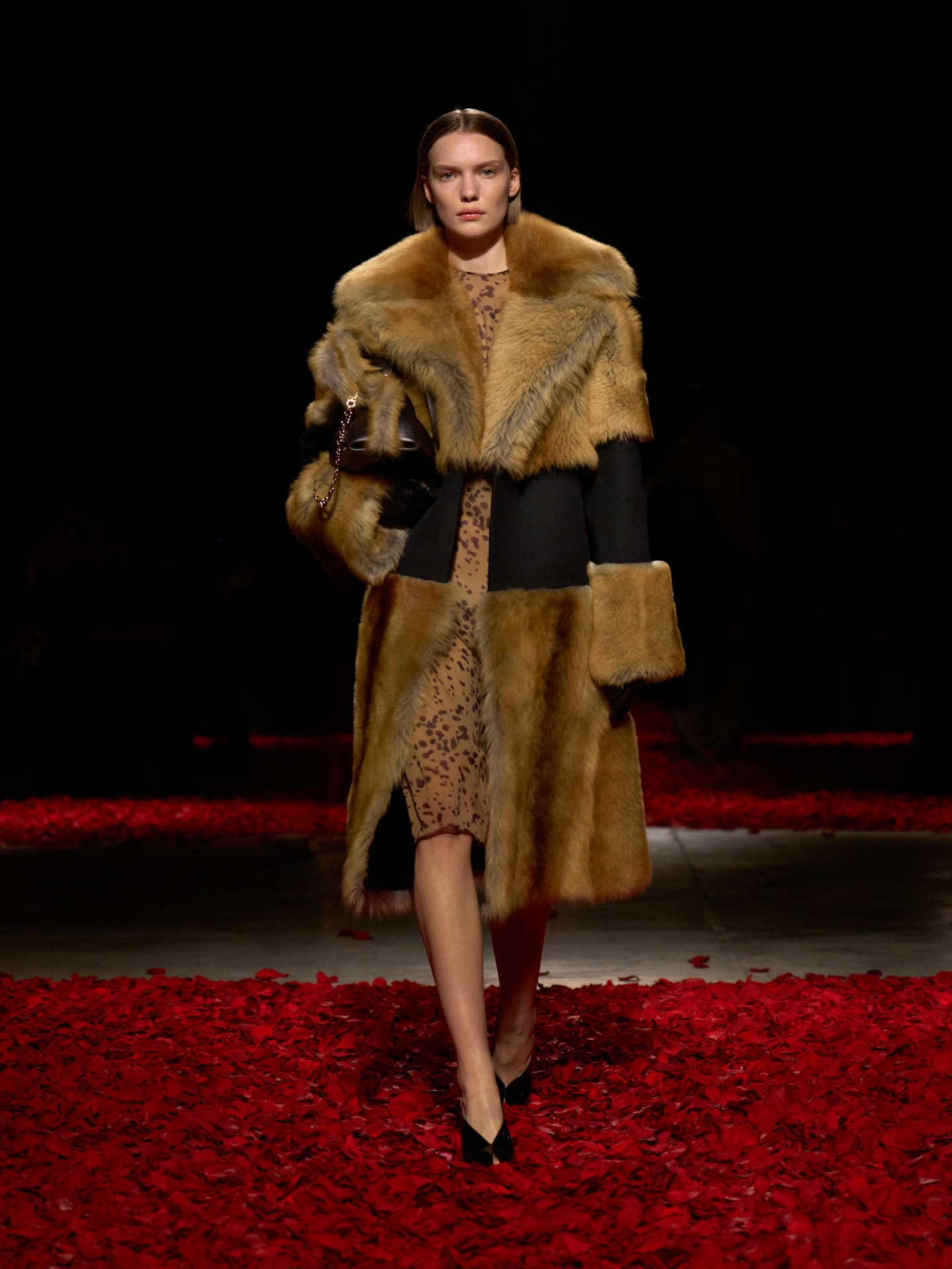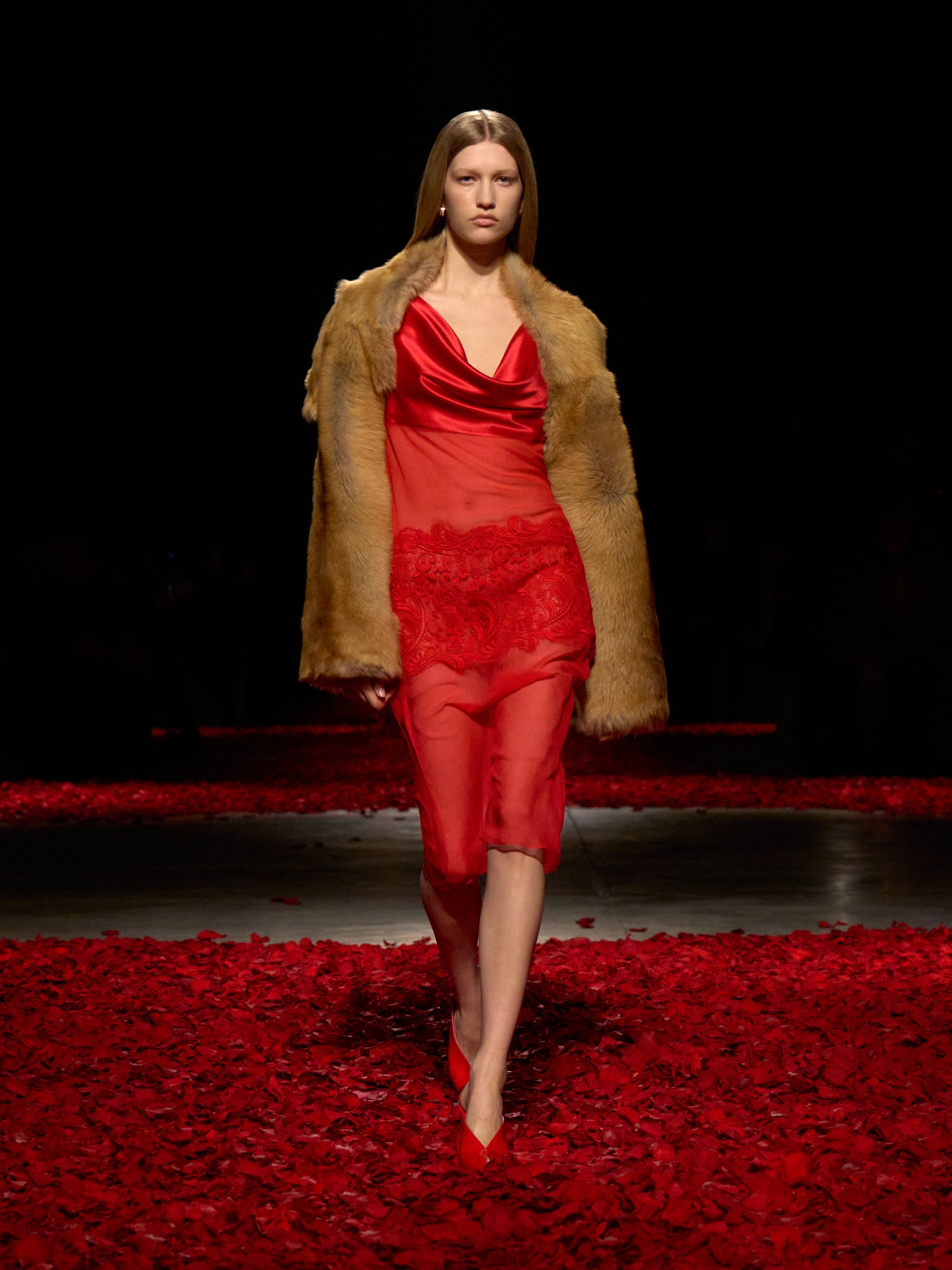 The garments evoke the creative freedom of dance in those decades: silk dresses adorned with lace and shearling inserts, satin trenches that envelop the body, essential knitwear, and a refined balance of contrasting materials. Soft cashmere meets glossy leathers, while feathers and poppies transform the pieces into true visual performances.