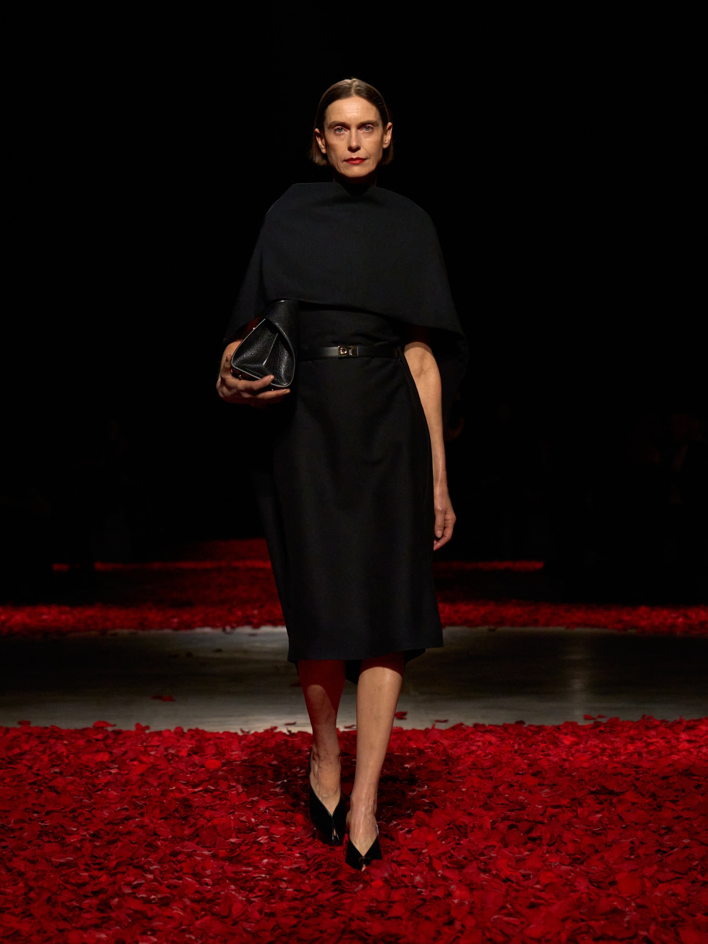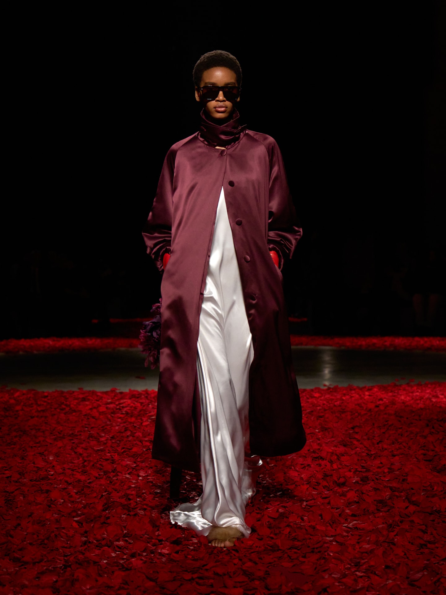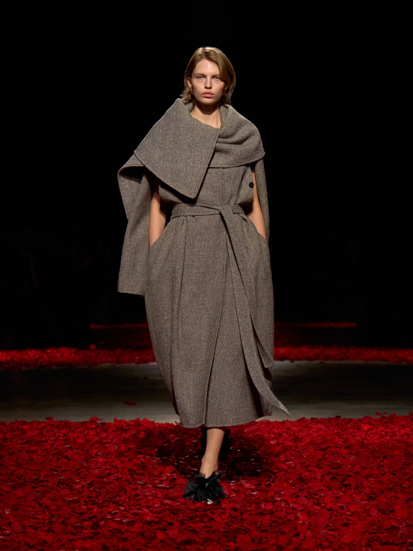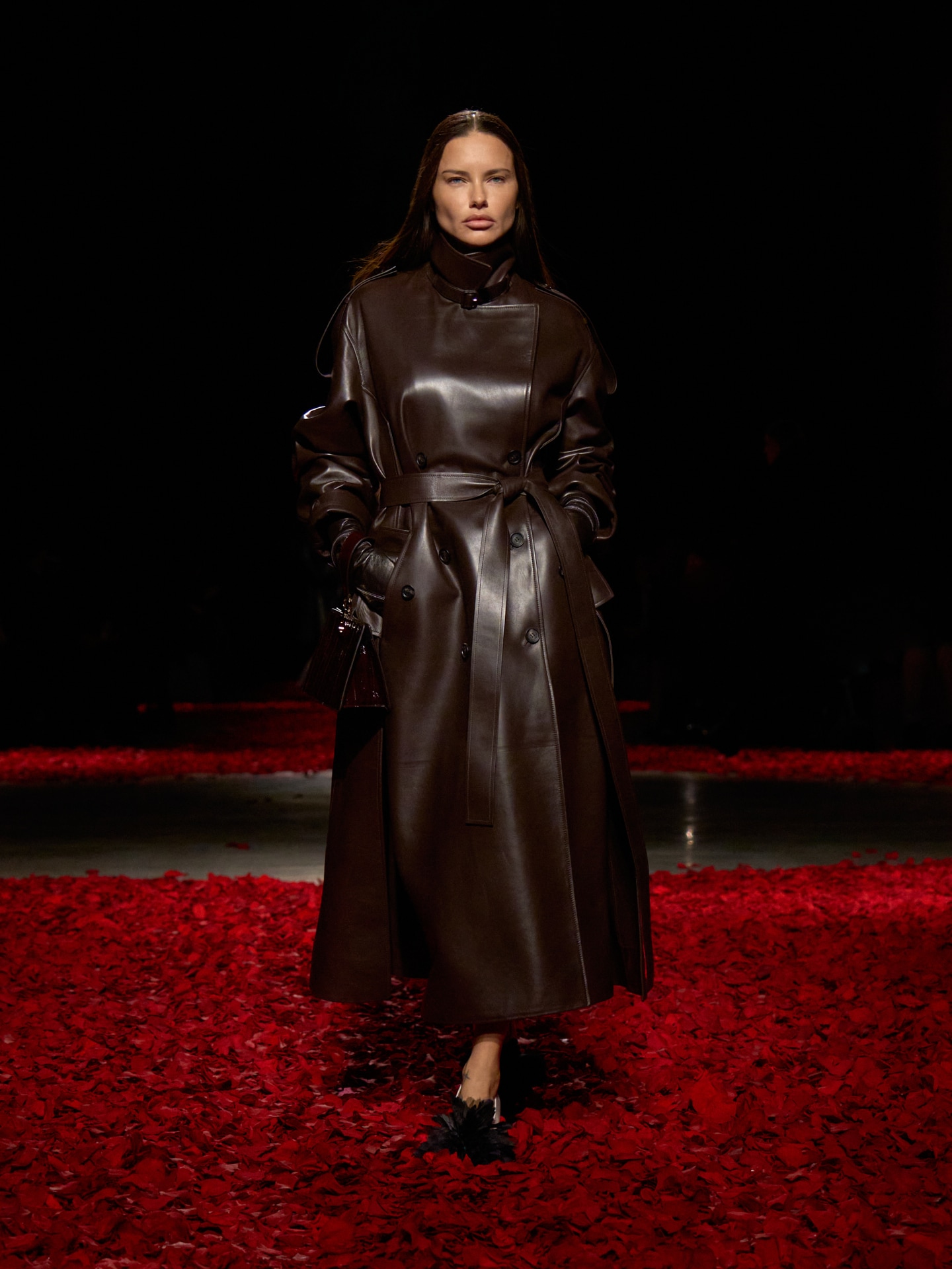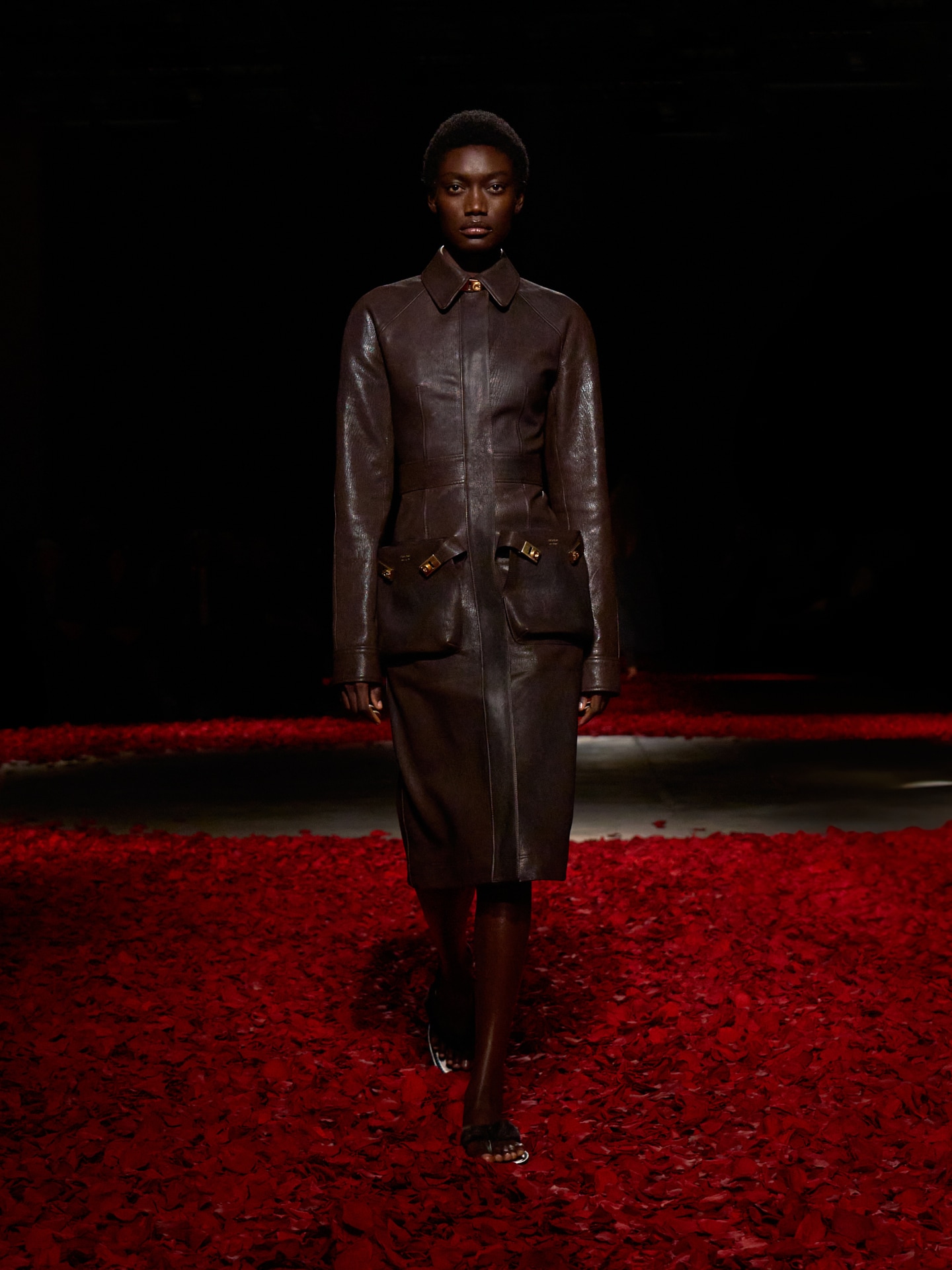 The garments evoke the creative freedom of dance in those decades: silk dresses adorned with lace and shearling inserts, satin trenches that envelop the body, essential knitwear, and a refined balance of contrasting materials. Soft cashmere meets glossy leathers, while feathers and poppies transform the pieces into true visual performances.
