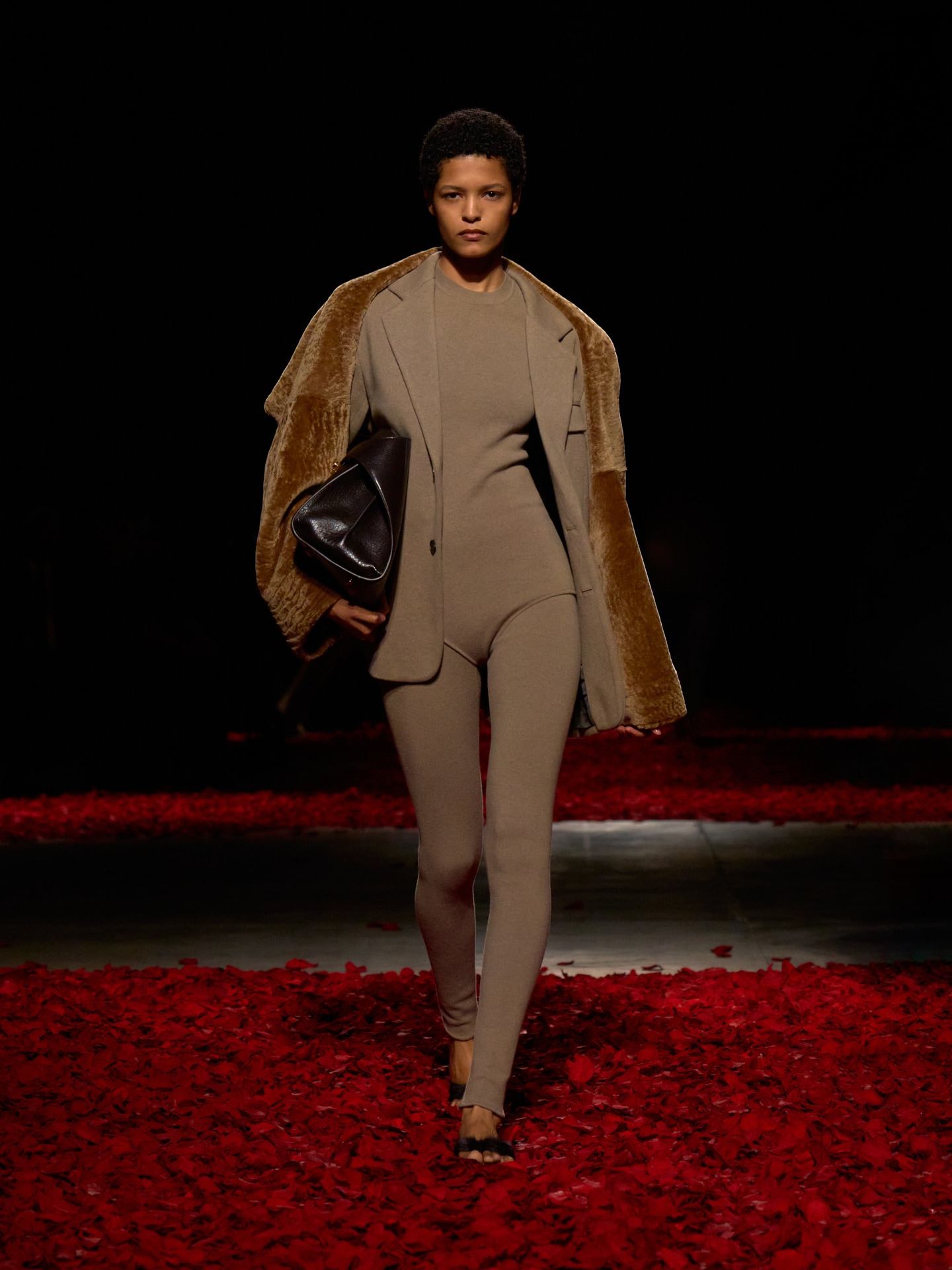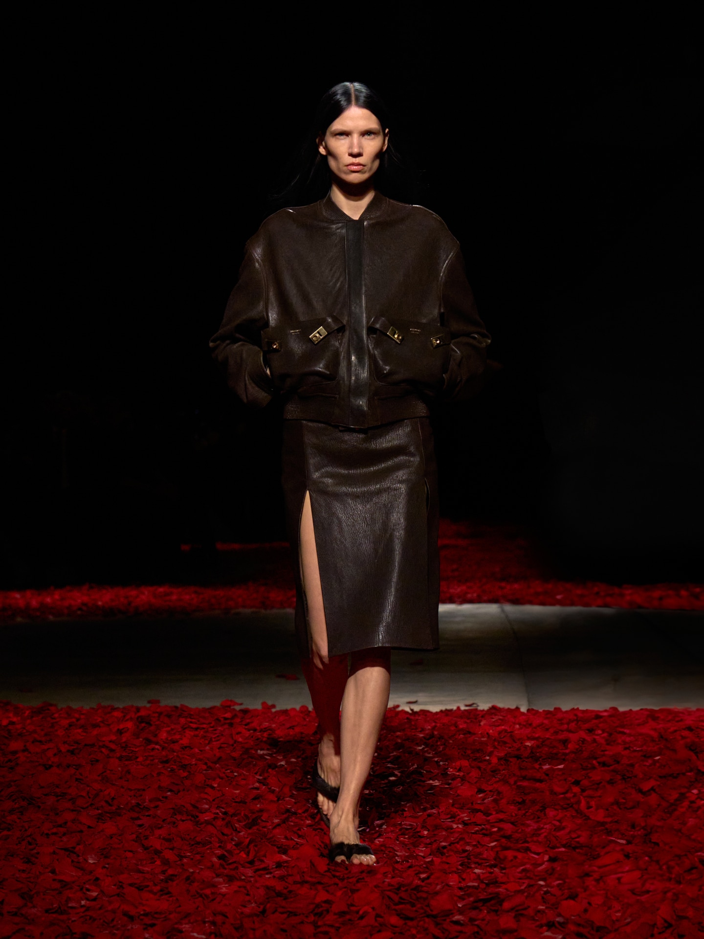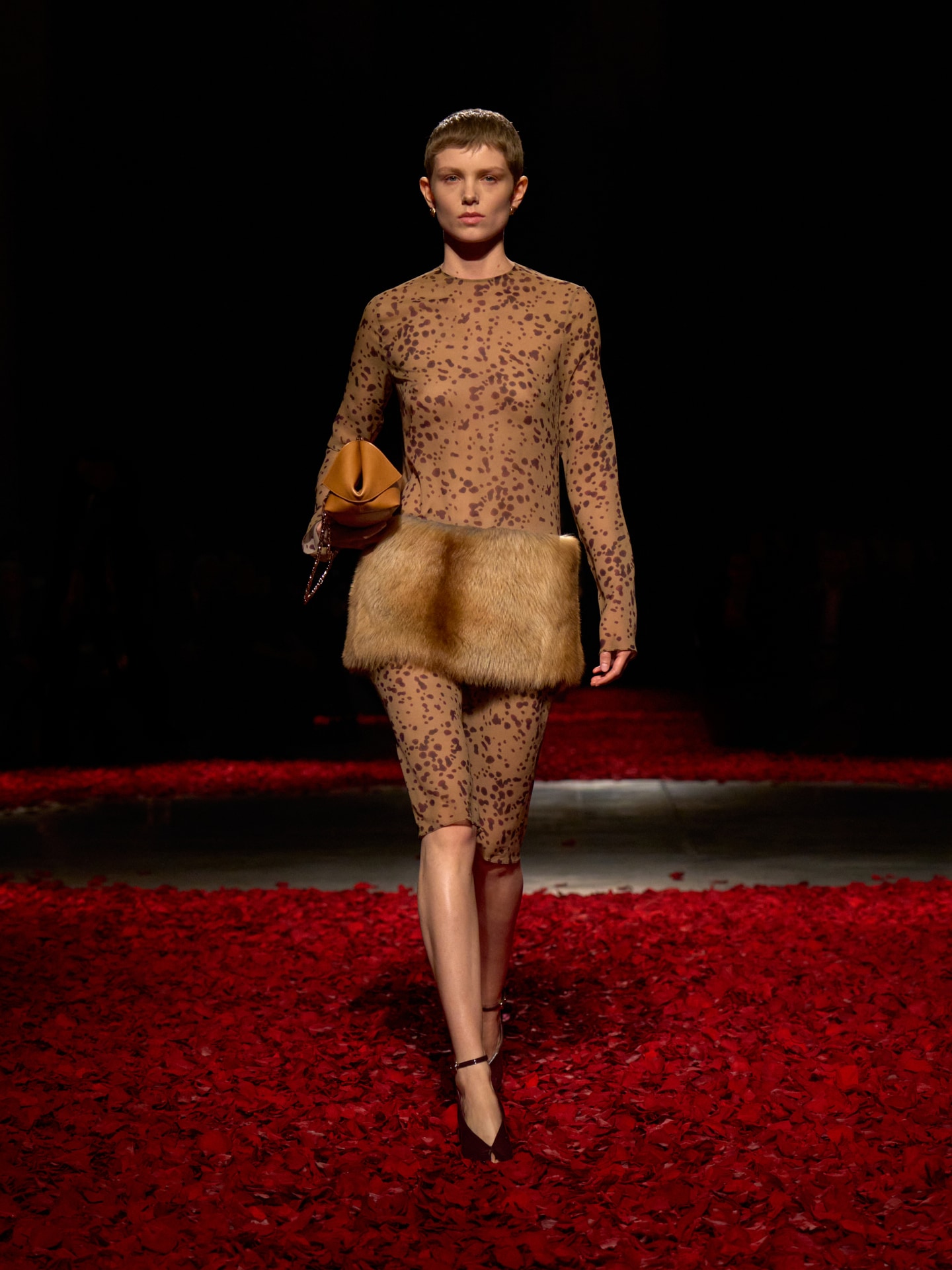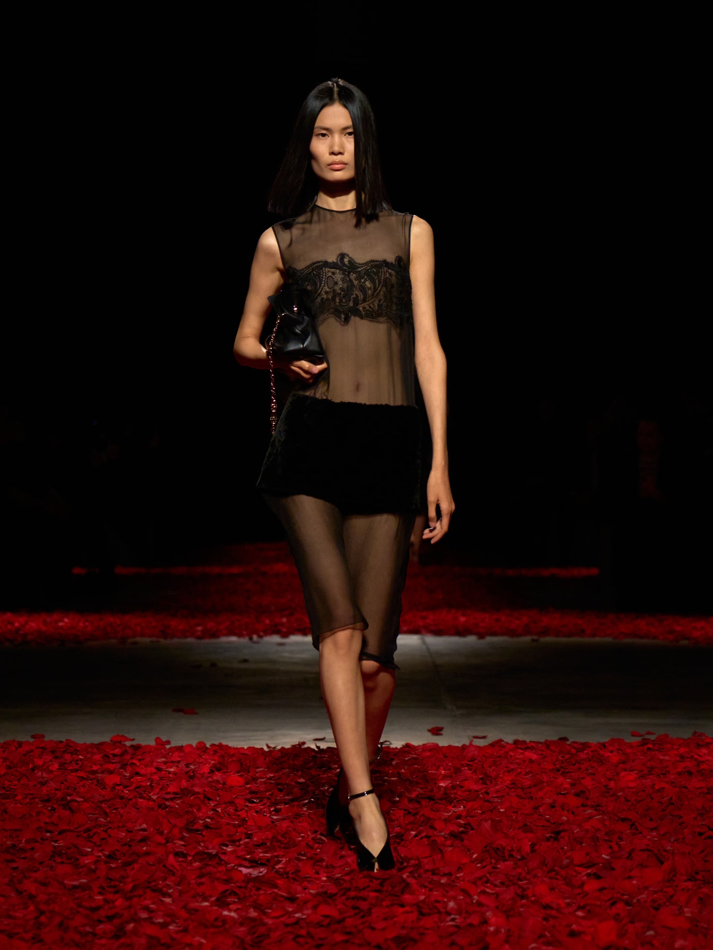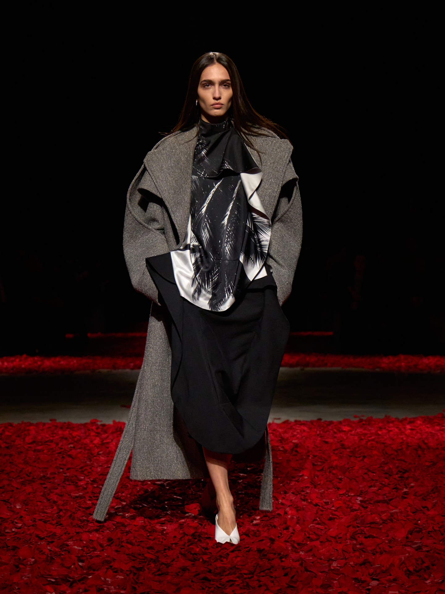 The garments evoke the creative freedom of dance in those decades: silk dresses adorned with lace and shearling inserts, satin trenches that envelop the body, essential knitwear, and a refined balance of contrasting materials. Soft cashmere meets glossy leathers, while feathers and poppies transform the pieces into true visual performances.