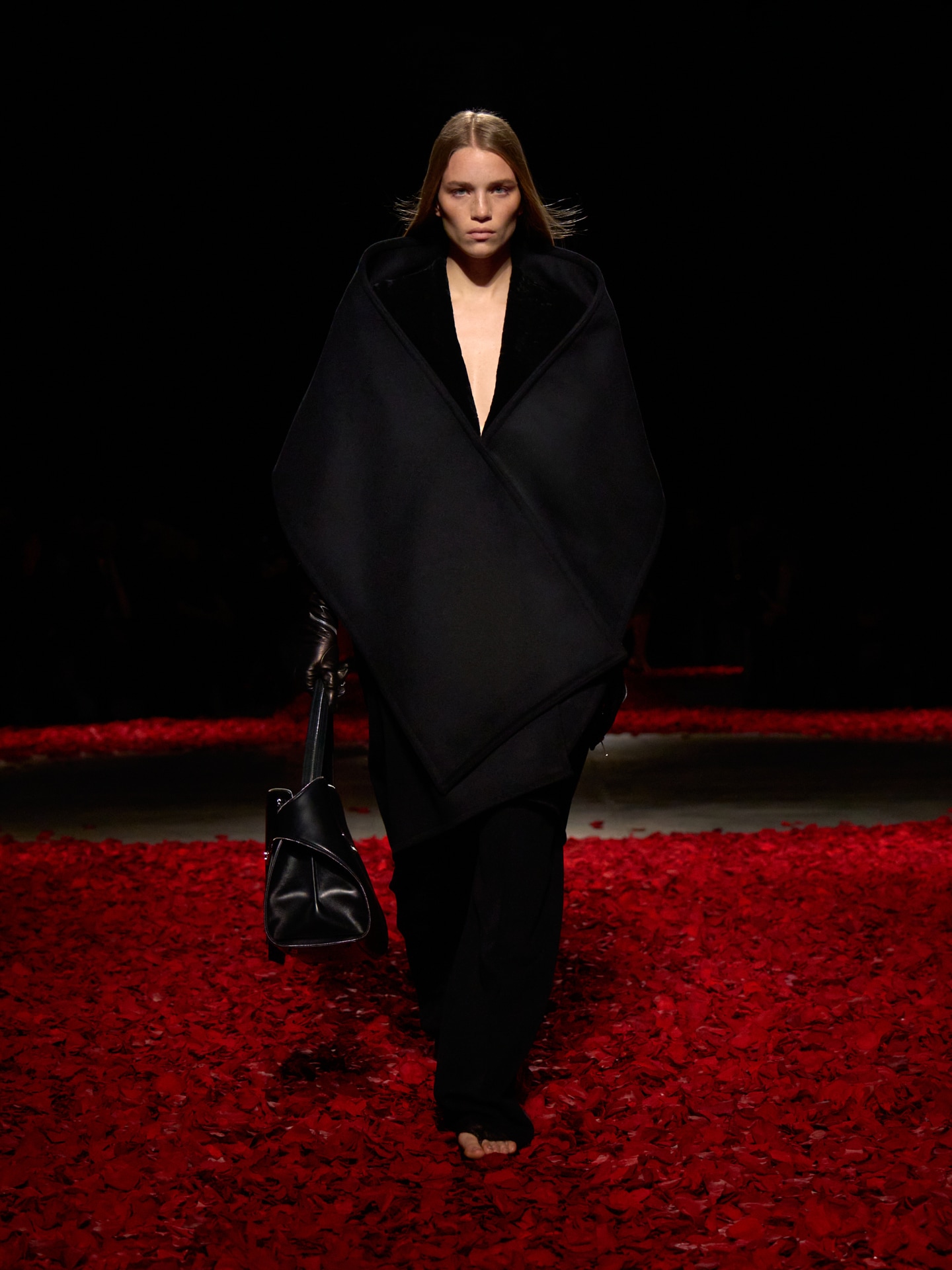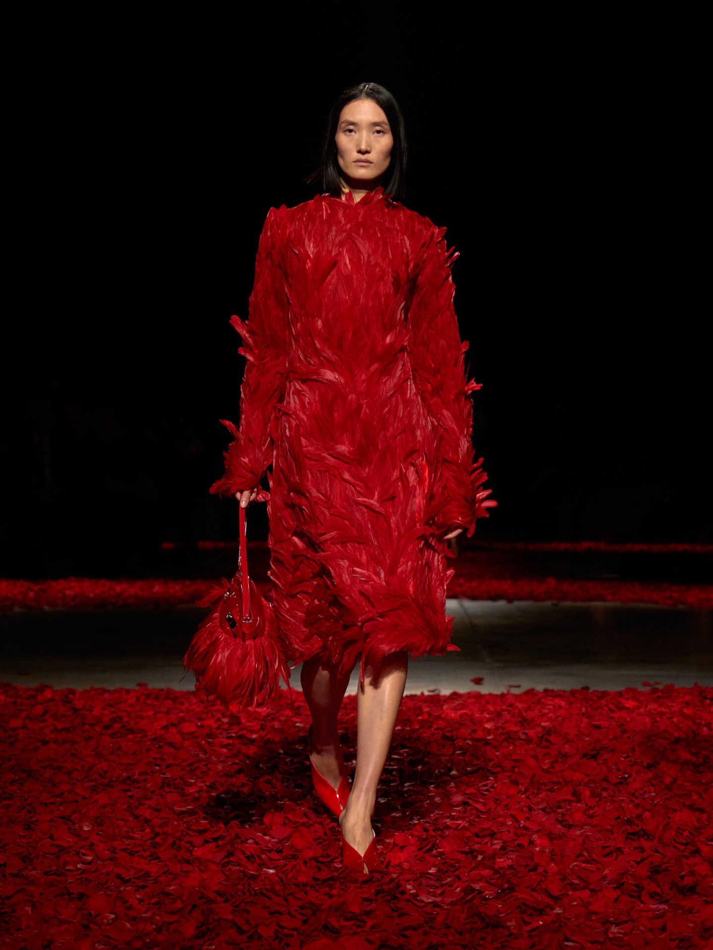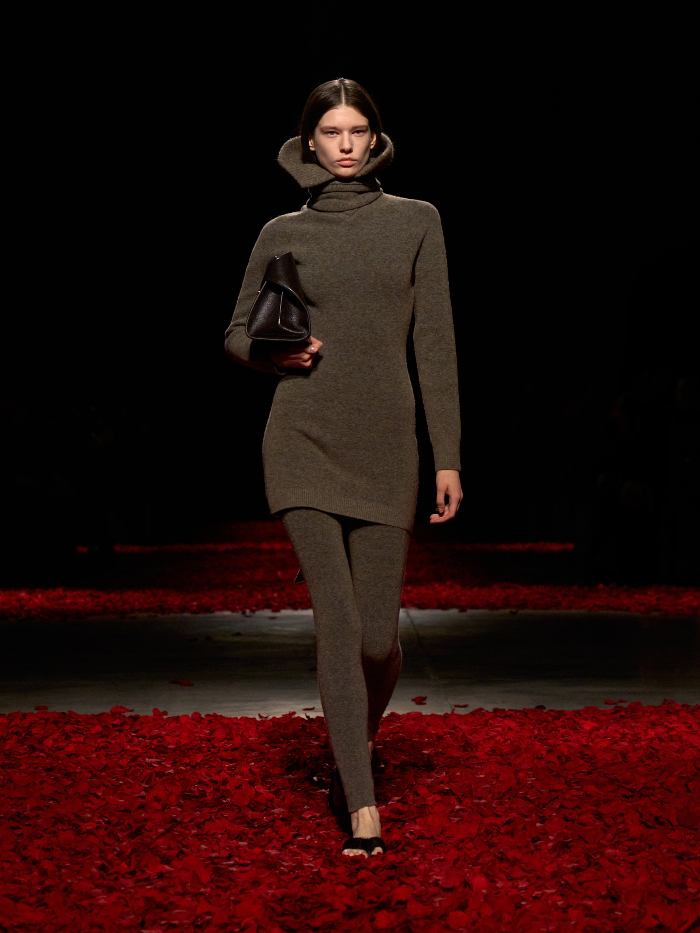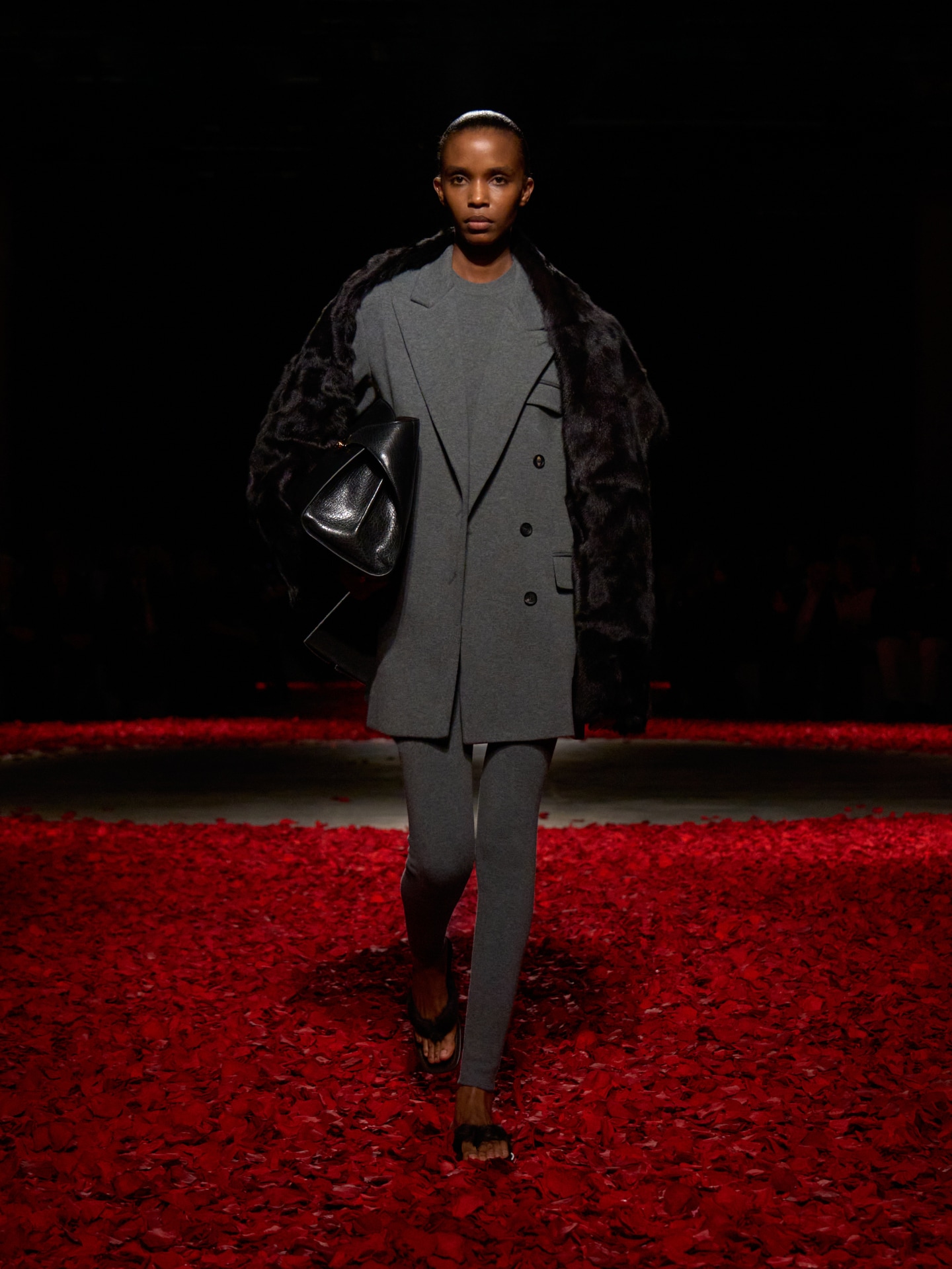 The garments evoke the creative freedom of dance in those decades: silk dresses adorned with lace and shearling inserts, satin trenches that envelop the body, essential knitwear, and a refined balance of contrasting materials. Soft cashmere meets glossy leathers, while feathers and poppies transform the pieces into true visual performances.