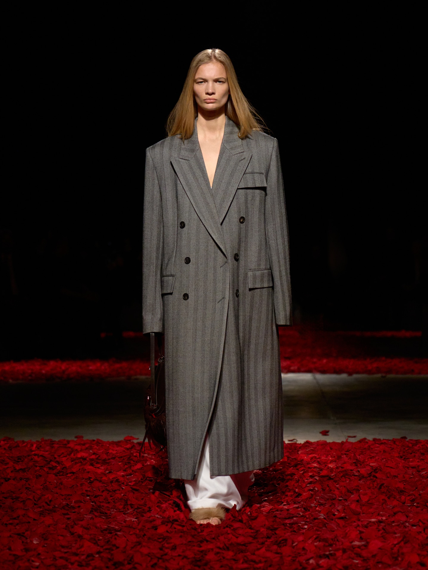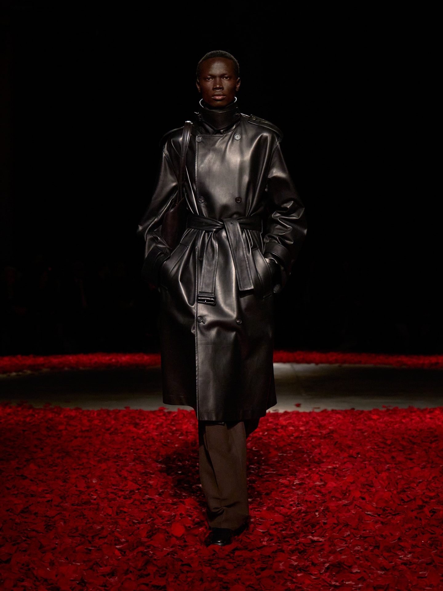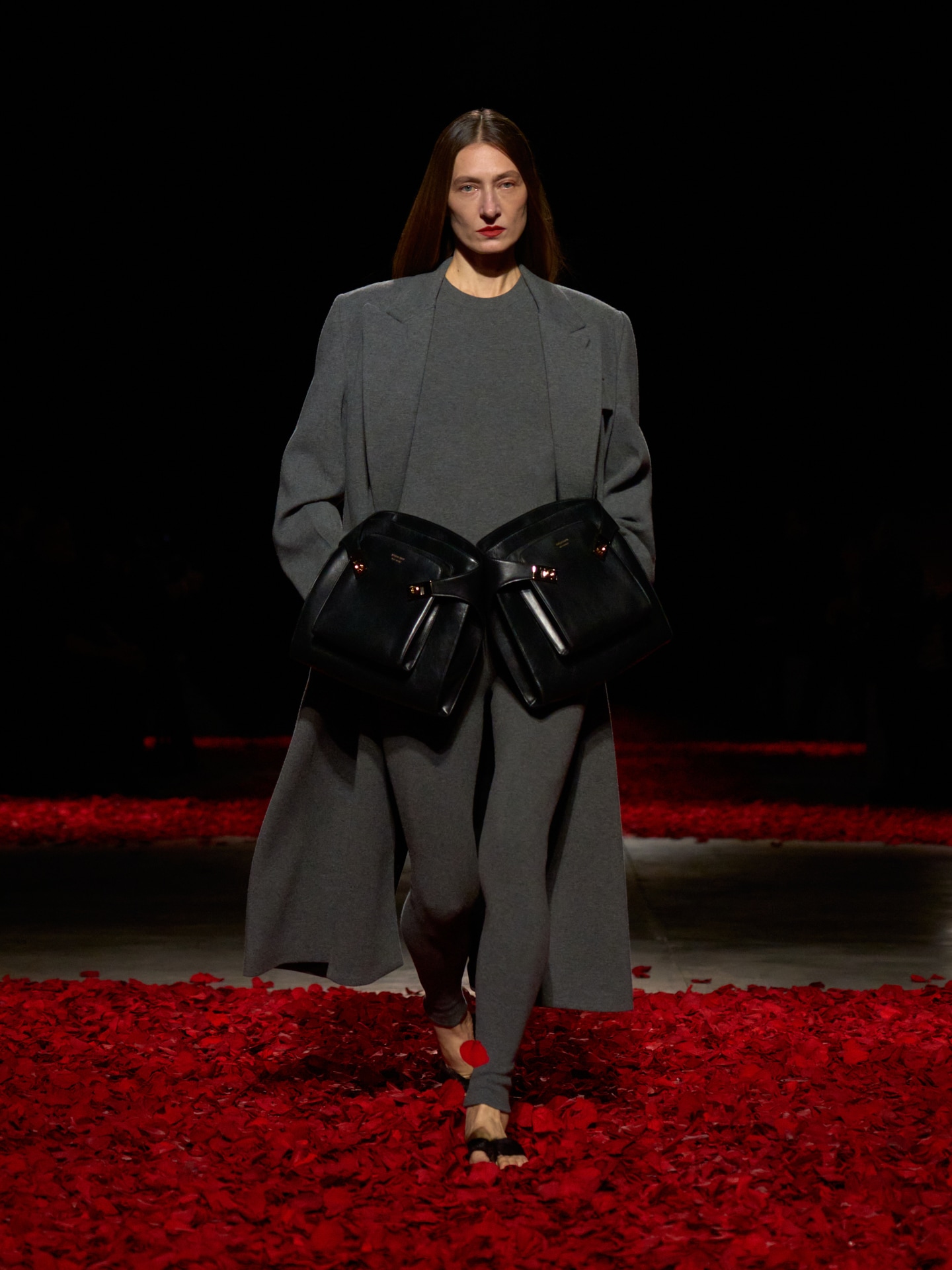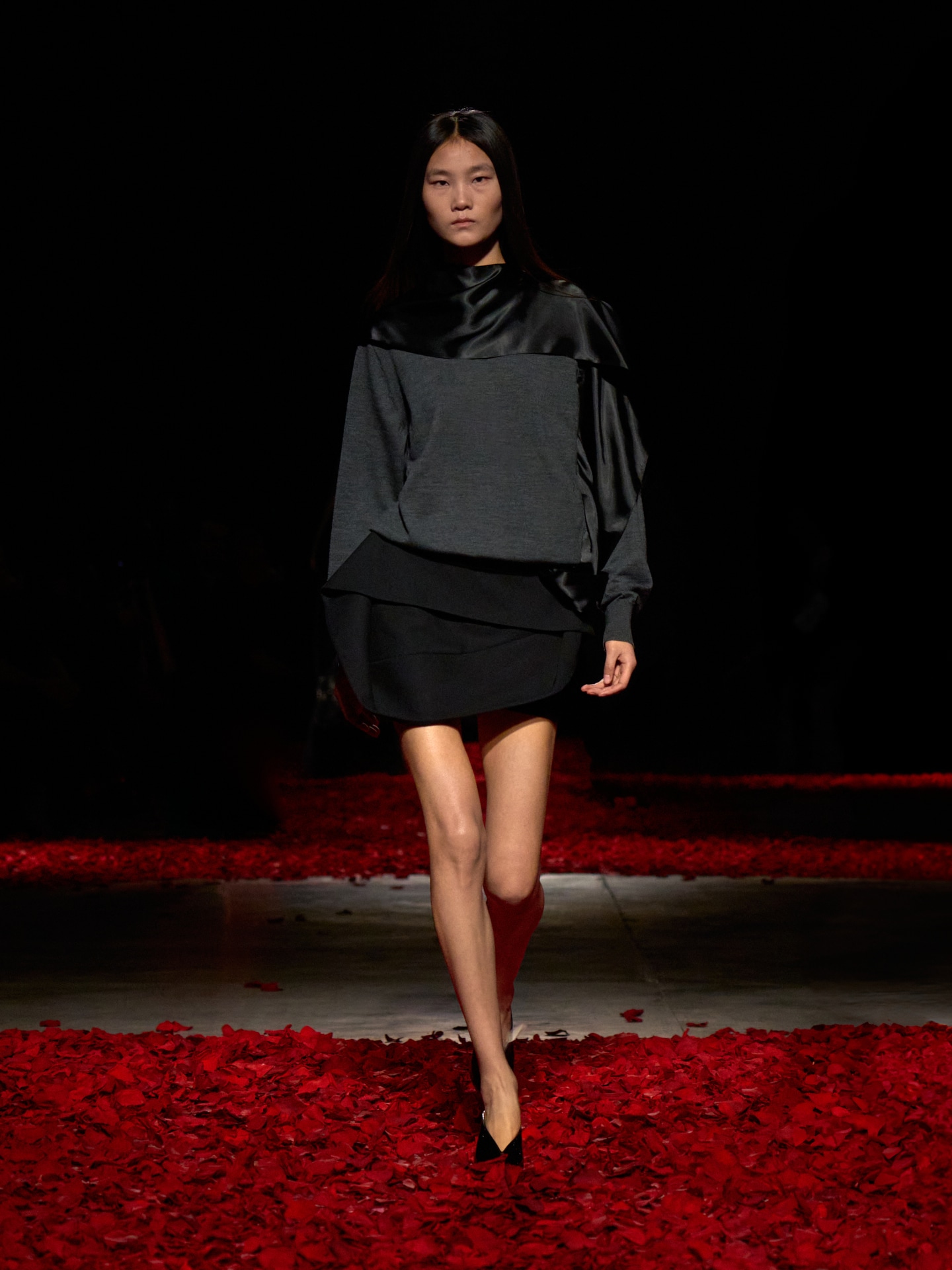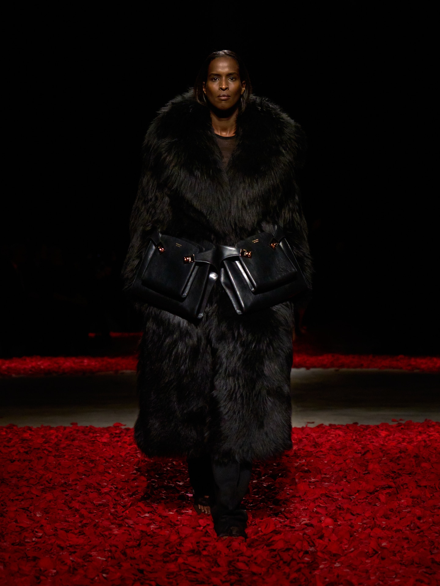 The garments evoke the creative freedom of dance in those decades: silk dresses adorned with lace and shearling inserts, satin trenches that envelop the body, essential knitwear, and a refined balance of contrasting materials. Soft cashmere meets glossy leathers, while feathers and poppies transform the pieces into true visual performances.