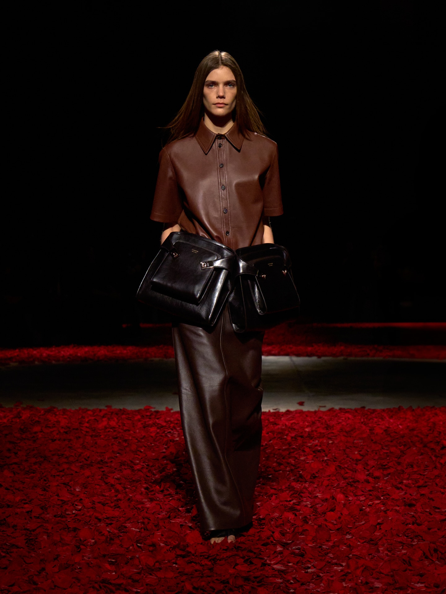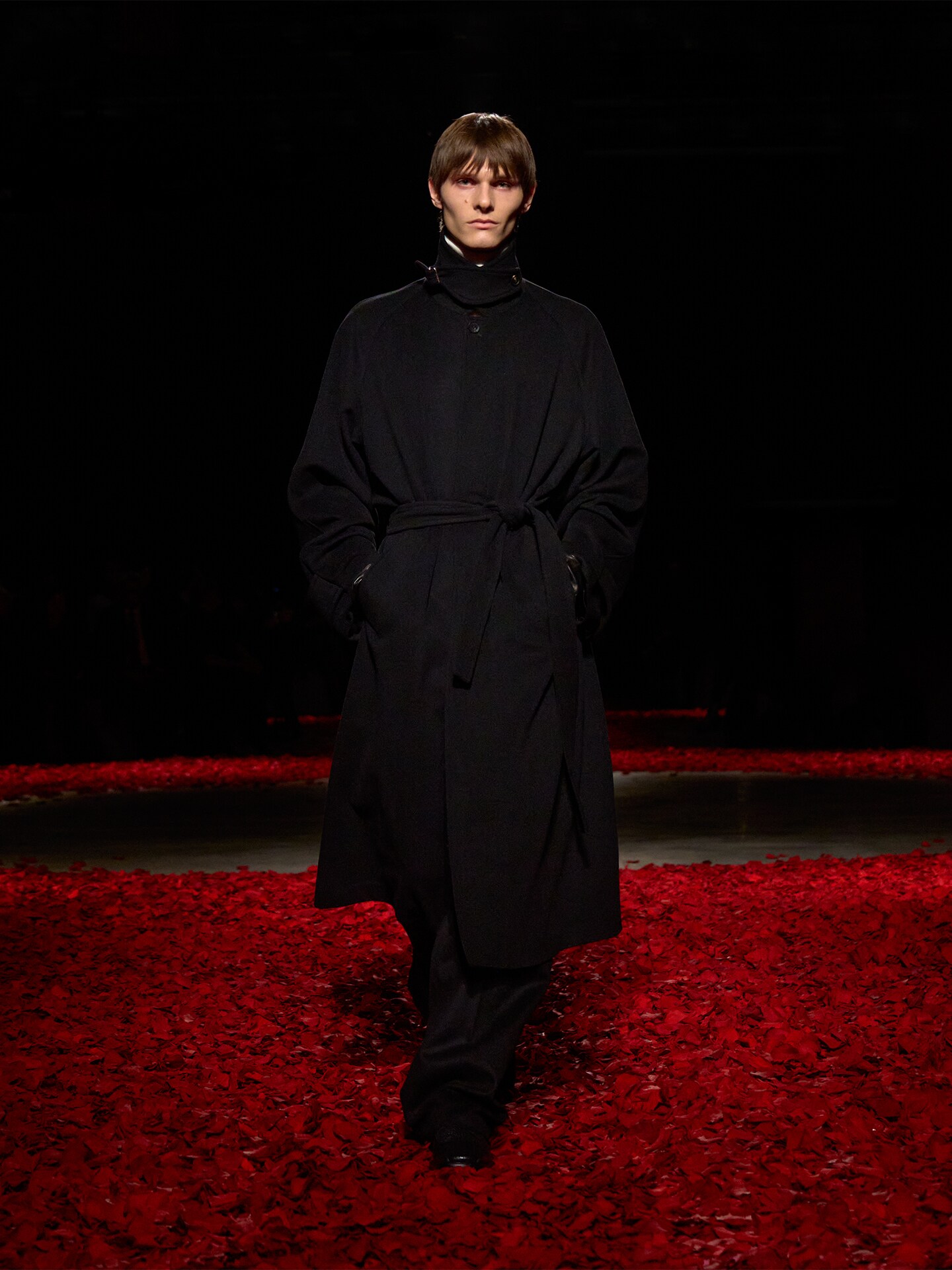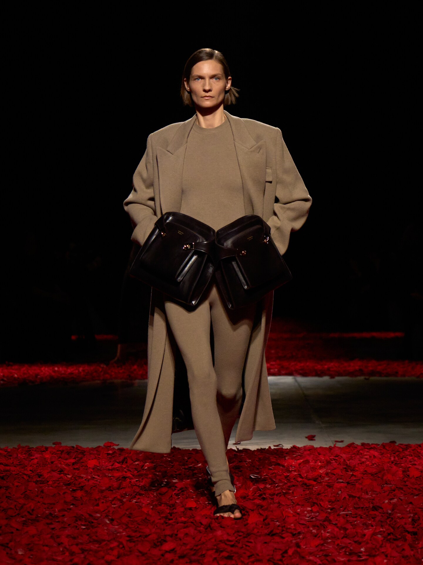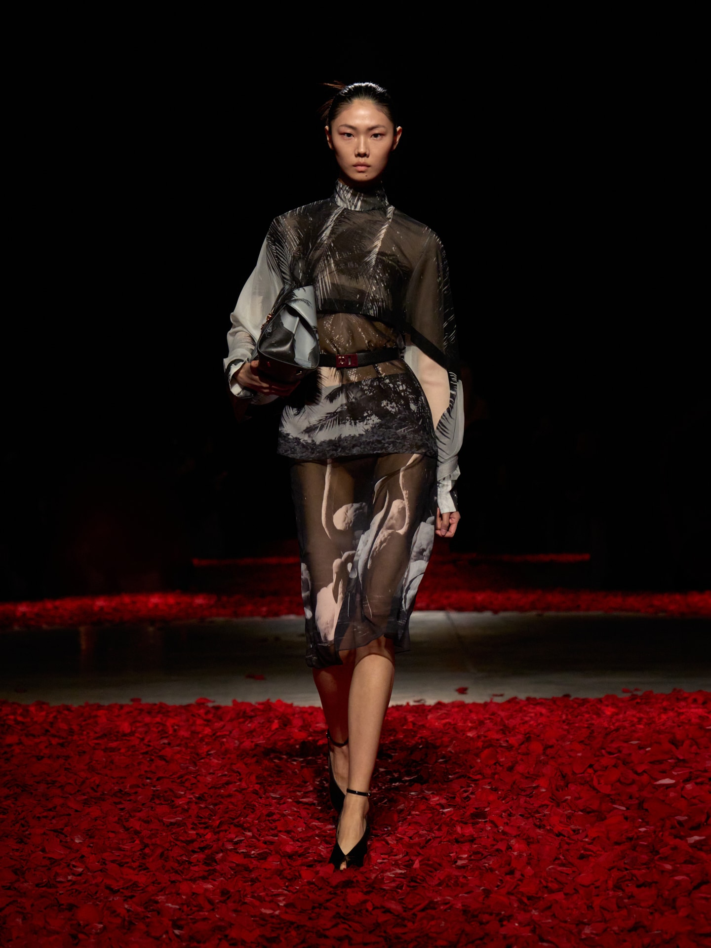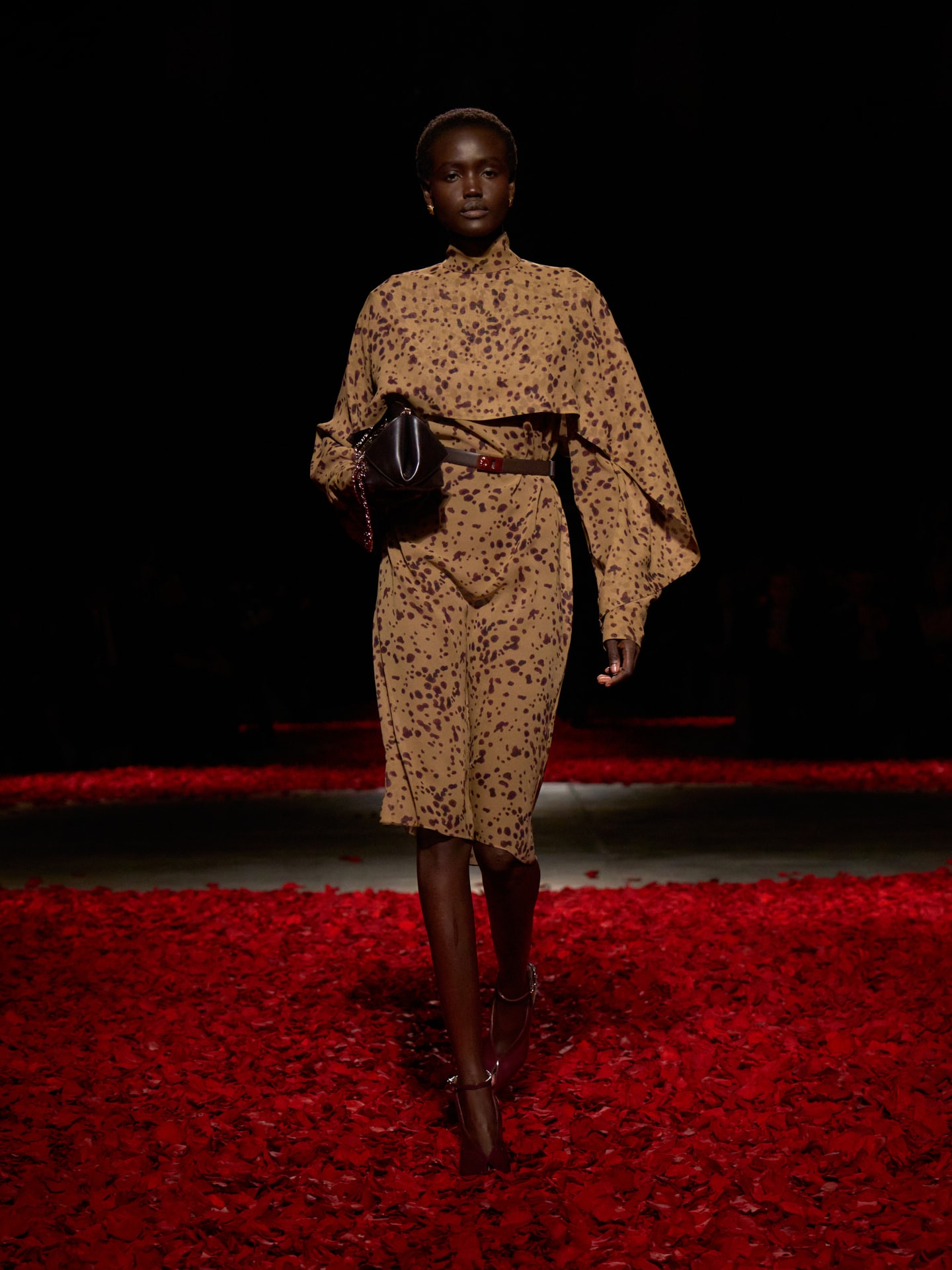 The garments evoke the creative freedom of dance in those decades: silk dresses adorned with lace and shearling inserts, satin trenches that envelop the body, essential knitwear, and a refined balance of contrasting materials. Soft cashmere meets glossy leathers, while feathers and poppies transform the pieces into true visual performances.