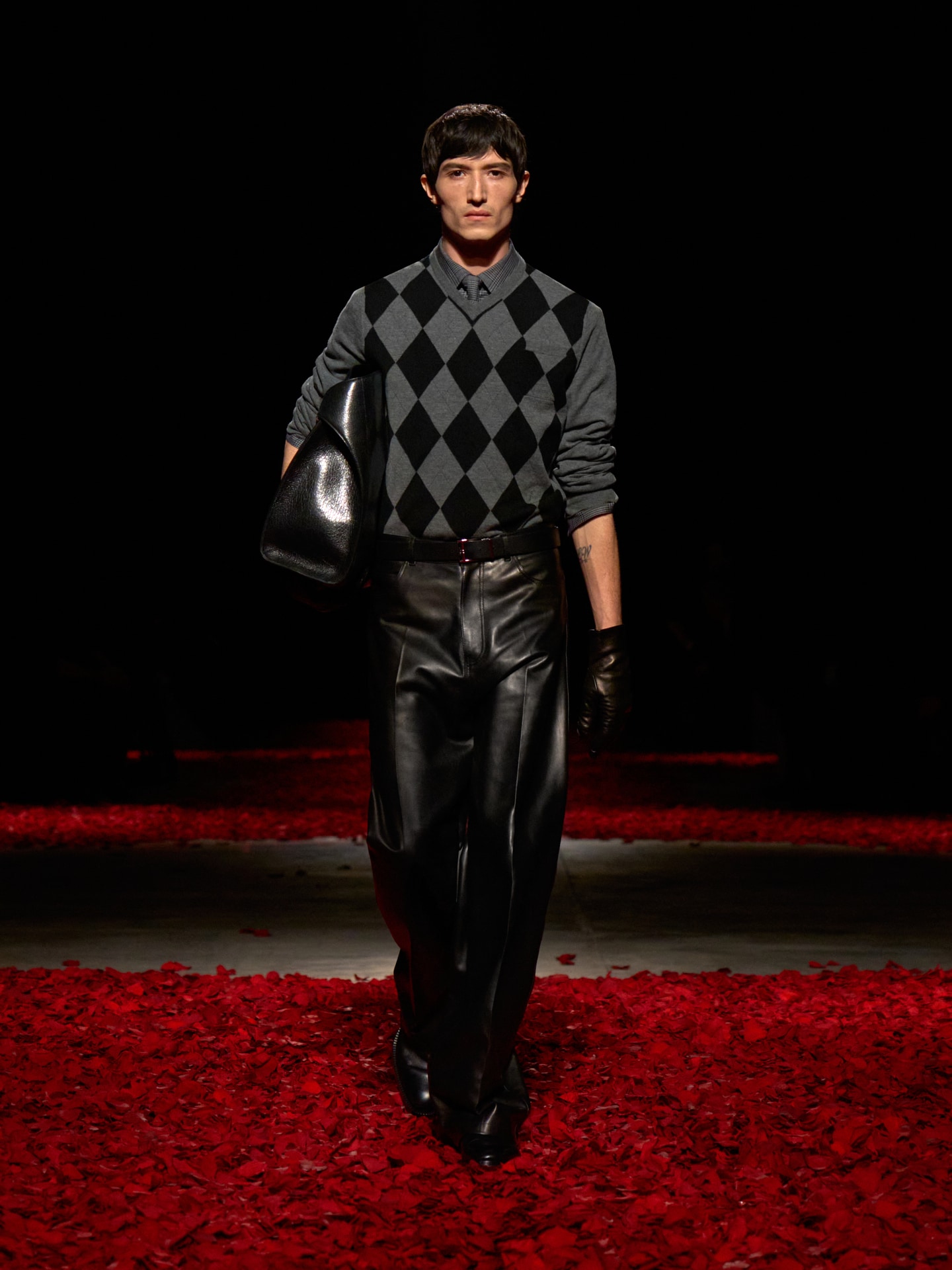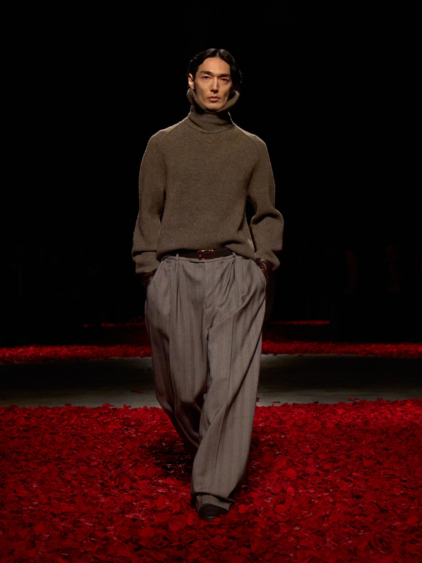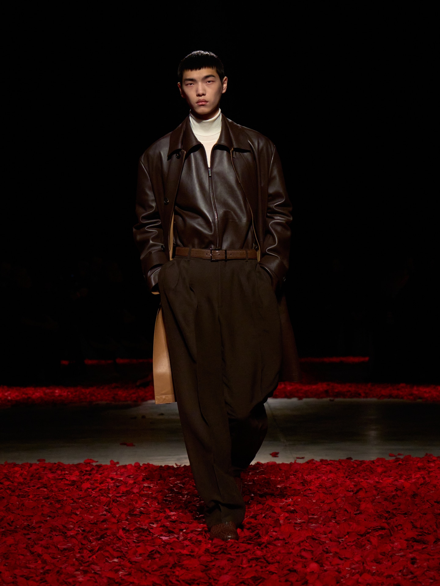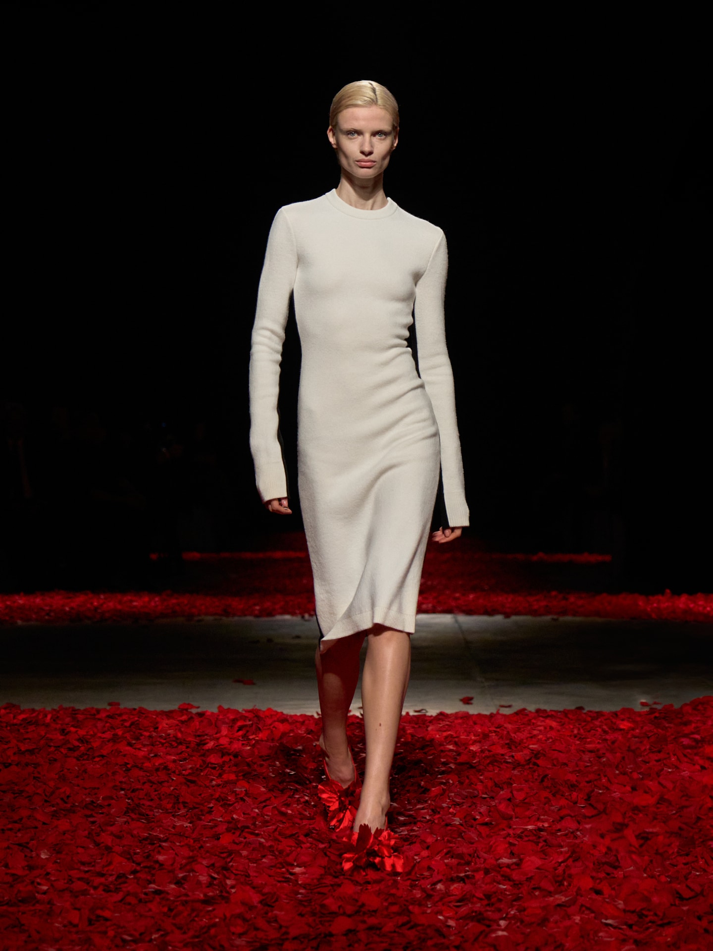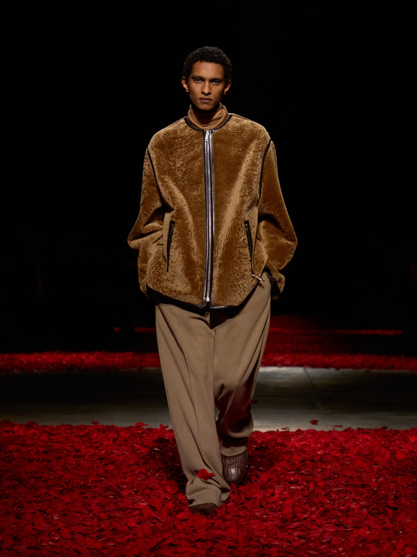The garments evoke the creative freedom of dance in those decades: silk dresses adorned with lace and shearling inserts, satin trenches that envelop the body, essential knitwear, and a refined balance of contrasting materials. Soft cashmere meets glossy leathers, while feathers and poppies transform the pieces into true visual performances.