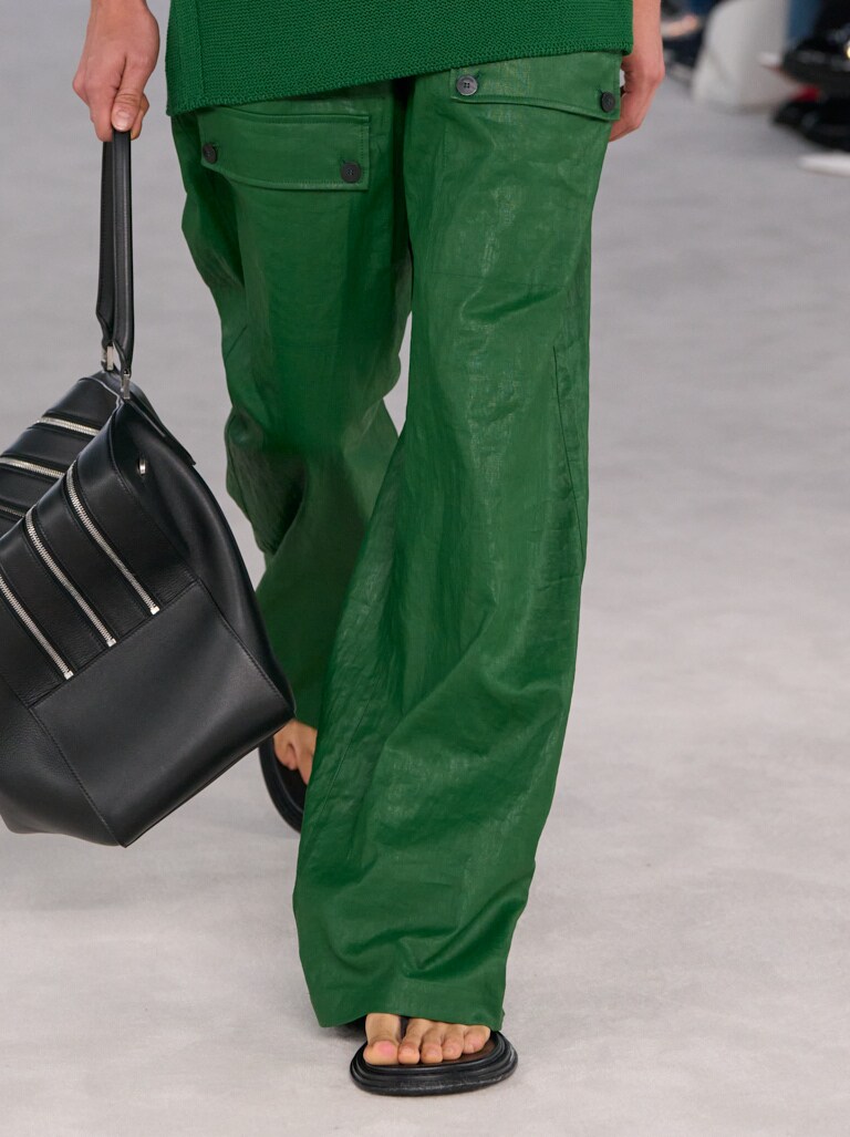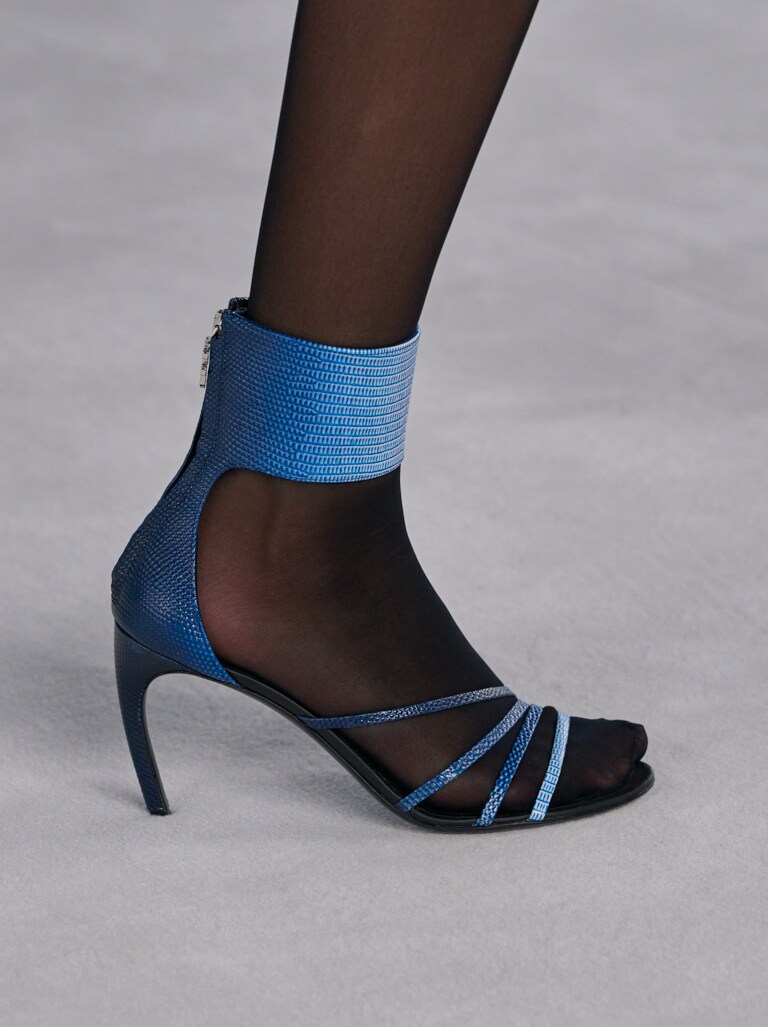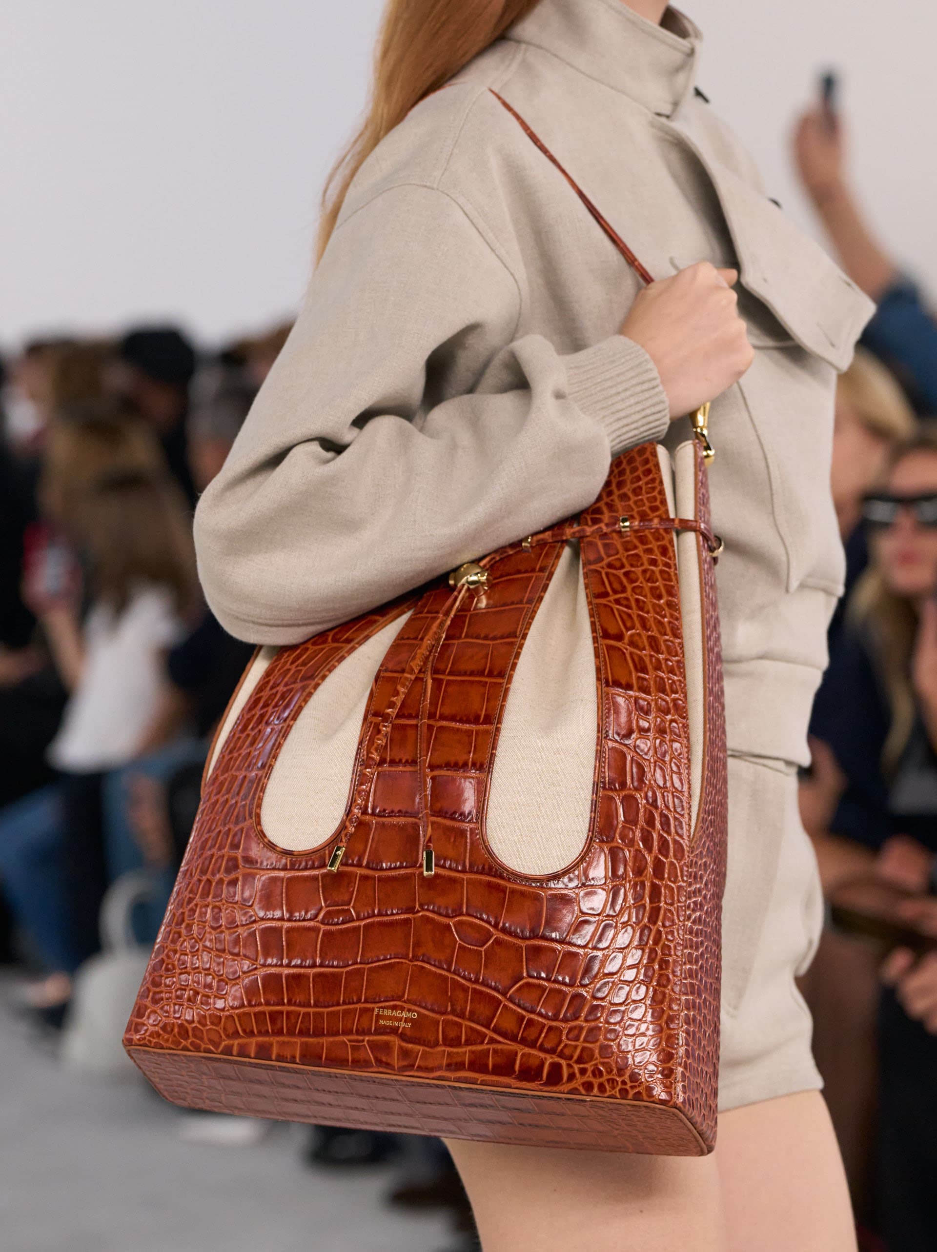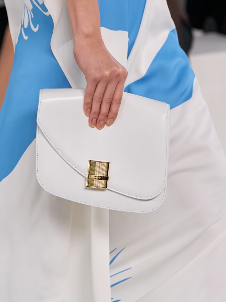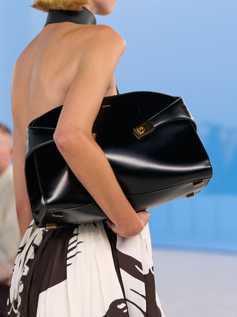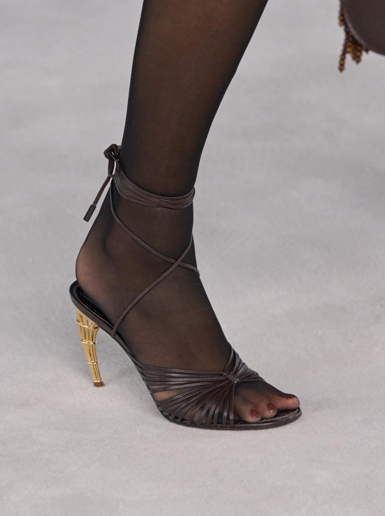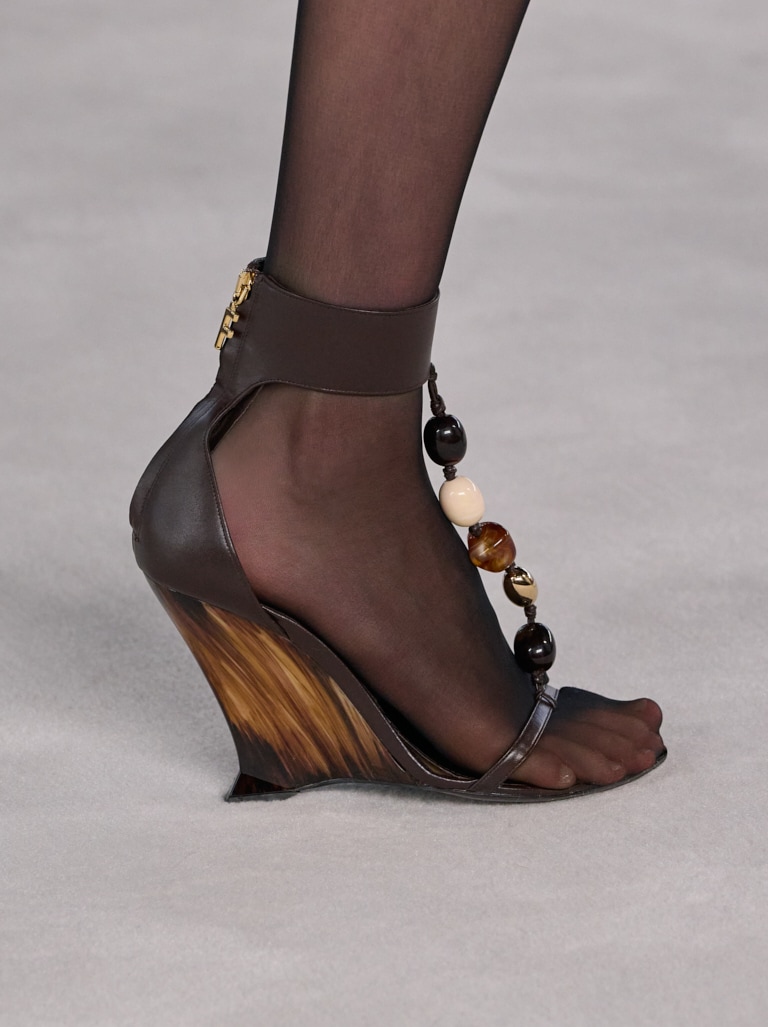Beschläge und Schmuck weisen organische Formen aus Holz und Metall auf. Eine Sandale mit dem ikonischen Calypso-Absatz, inspiriert vom Archiv, wird mit einer 3D-Drucktechnik neu gestaltet. Andere Schuhe mit Absätzen werden aus Holz, Mais und Horn geschmiedet, während die Taschen Hug und Fiamma neue Materialien und visuelle Codes verwenden. Es ist eine Saison der gehobenen Handwerkskunst und des anspruchsvollen Designs, ein zeitloser Ausdruck von Kunstfertigkeit und Verführung.