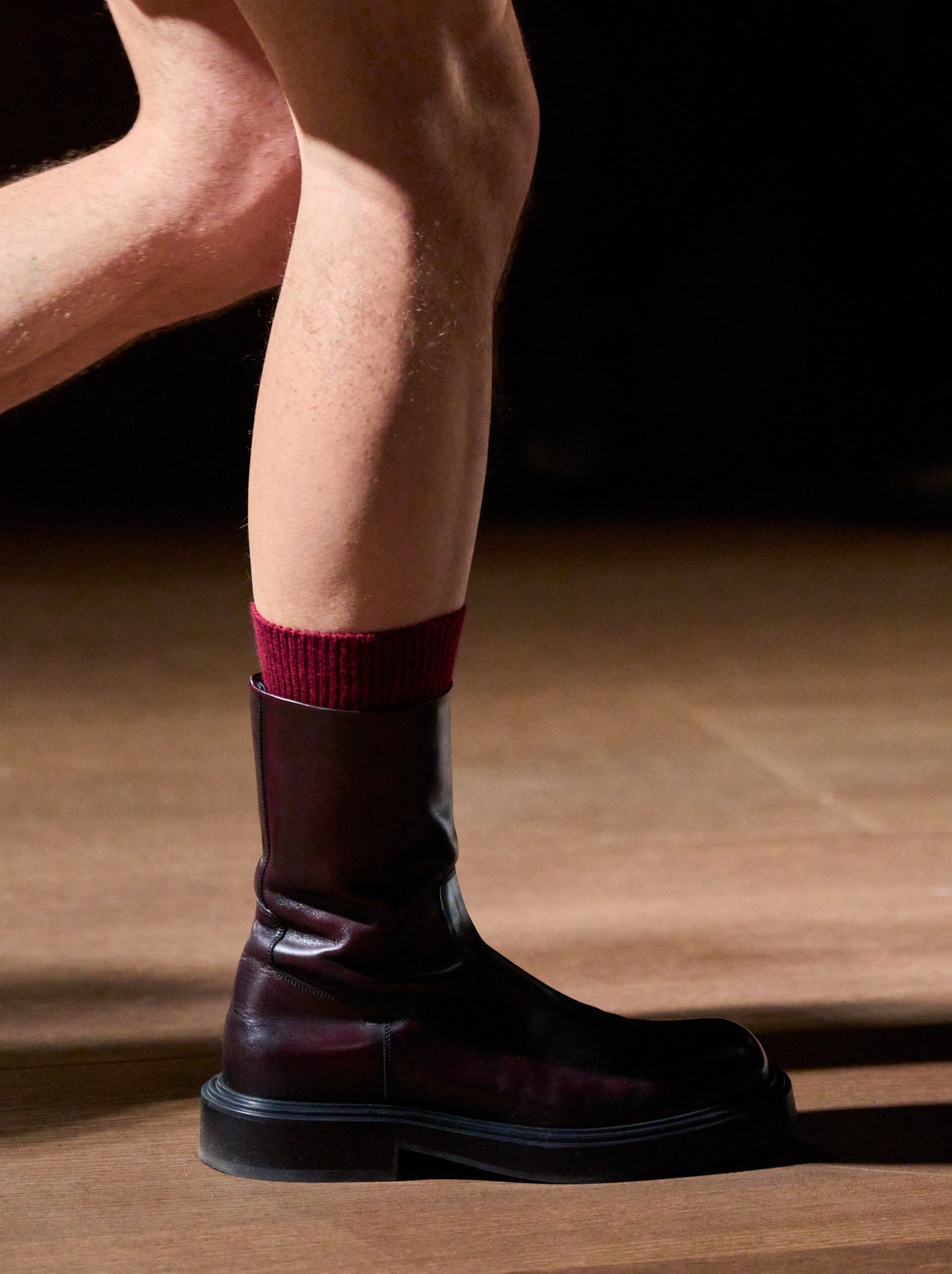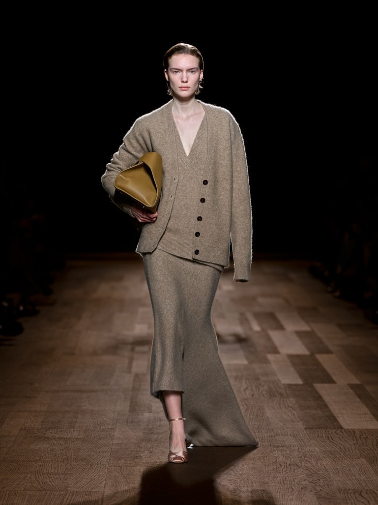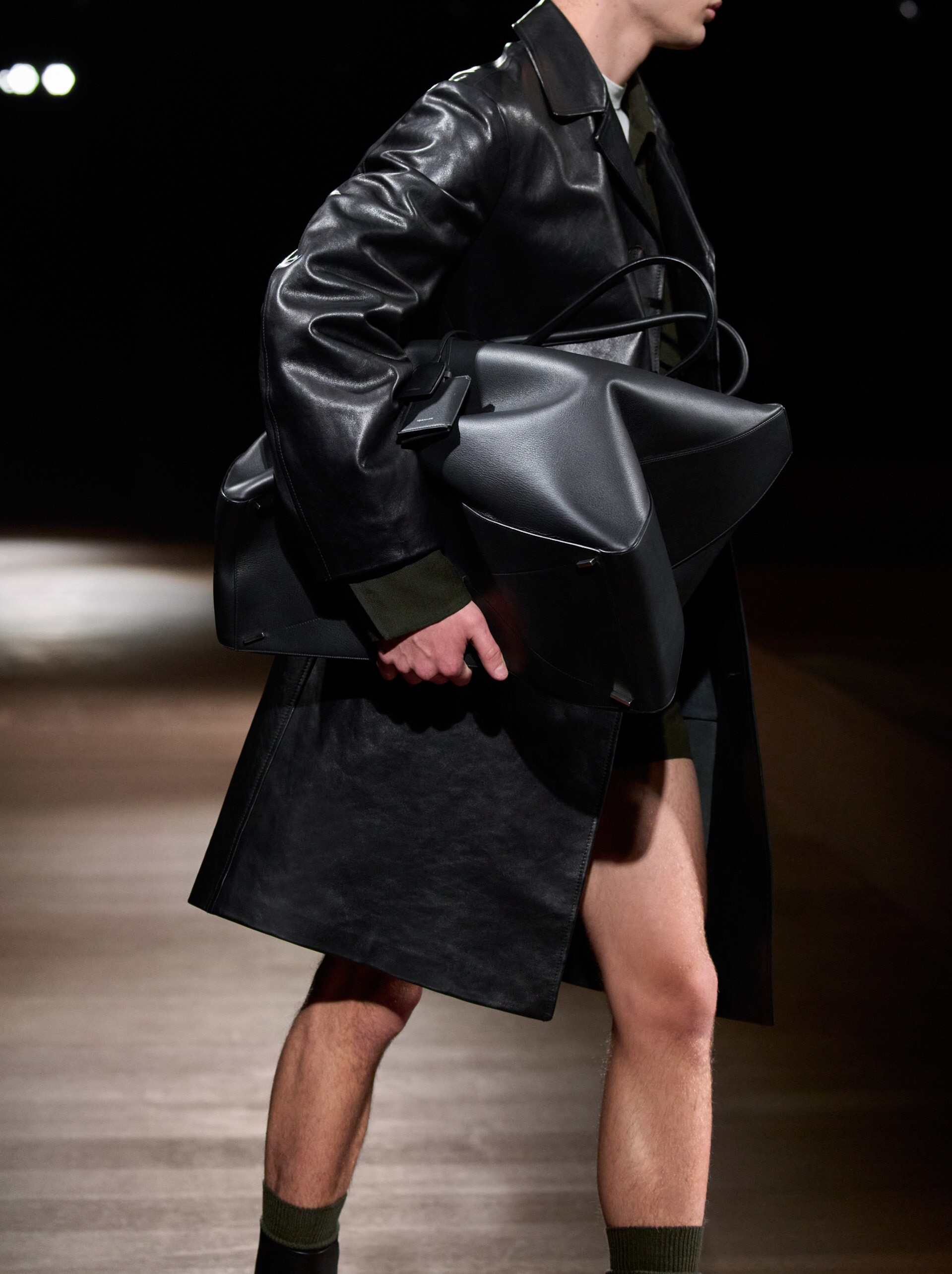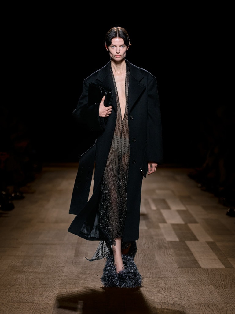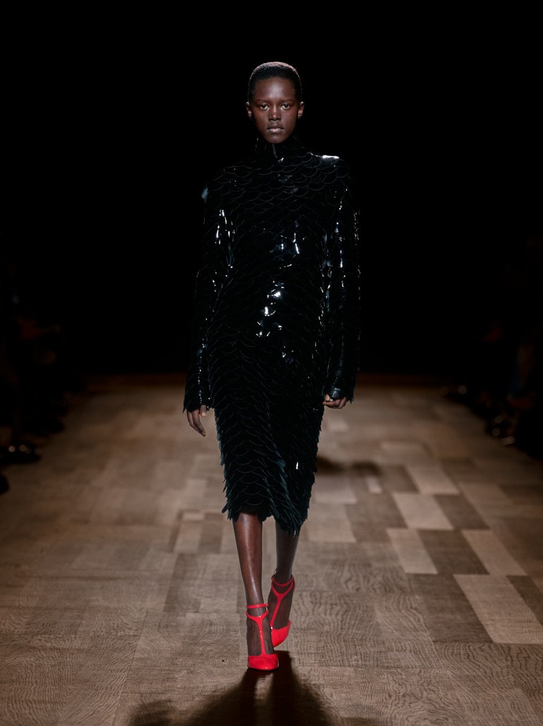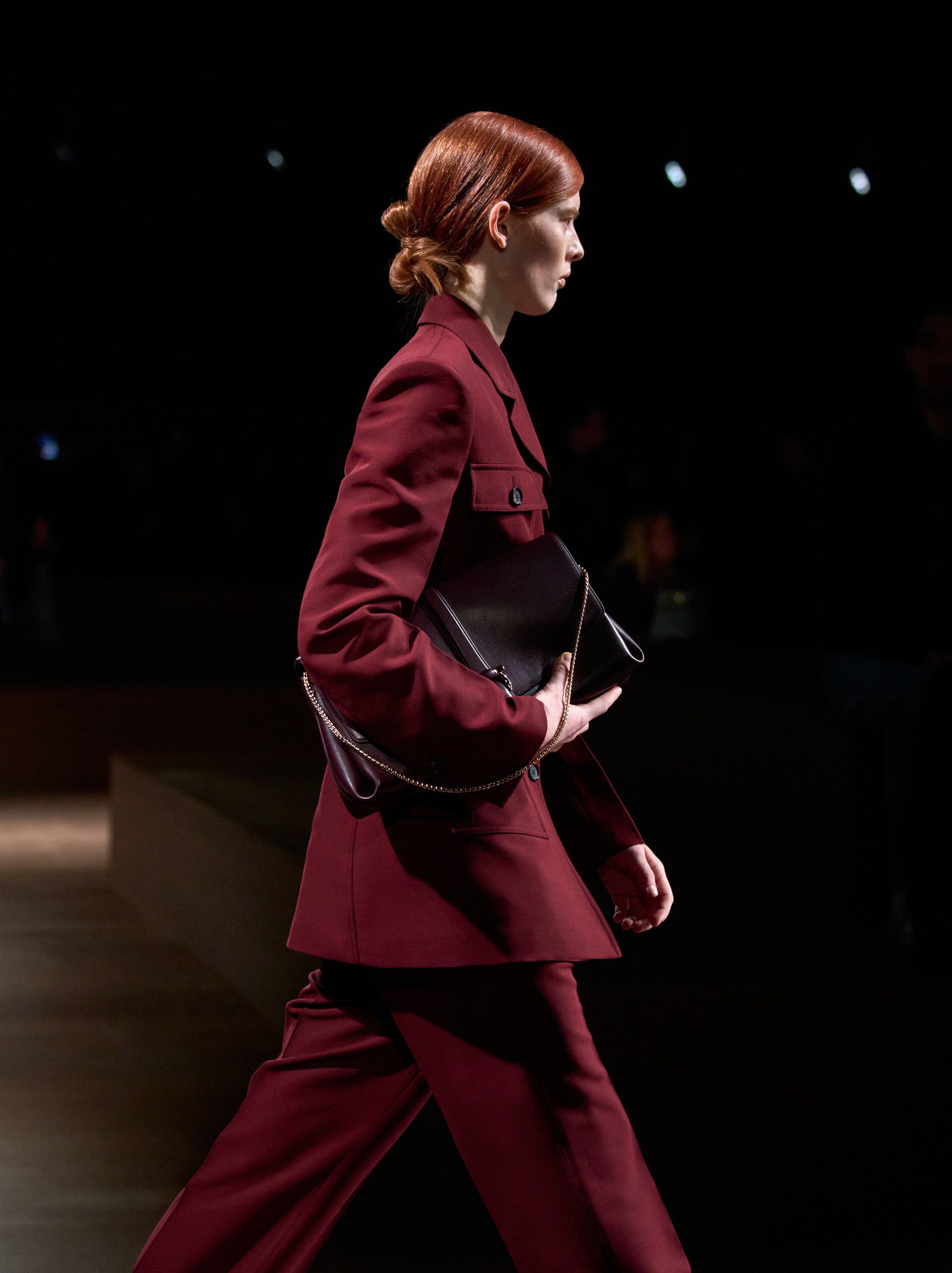 Aux côtés des robes en organdi laqué et des transparences hyper-féminines, des finitions plumetis et des broderies pailletées, les garde-robes des femmes qui ont choisi de s'habiller dans des silhouettes masculines se reflètent dans les épaules larges, les laines lourdes, les cuirs souples. Dans le tailoring, les revers pointus et sculpturaux évoquent un esprit surréaliste, leurs proportions sont déformées, l'effet de leur forme fait écho au portrait radiographique.