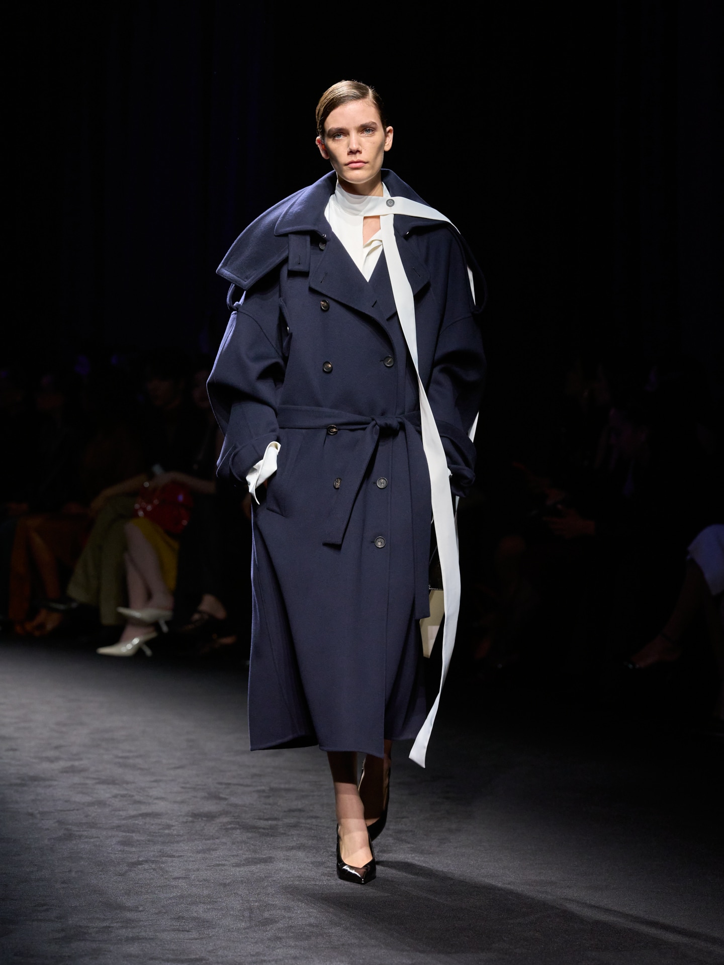 El calzado desempeña un papel decisivo en la narrativa de la temporada. Un nuevo stiletto de punta afilada y una sling‑back con escote profundo —ambos inspirados en un diseño de archivo de 1954— reinterpretan el legado de Ferragamo con una precisión refinada. Sus contrastes evocan códigos náuticos o se realzan con detalles que recuerdan a joyas. La técnica pionera de la “suela concha” desarrollada en los años 50, donde la suela envuelve el pie, inspira las líneas curvilíneas de las sandalias de tacón híbrido de la temporada, fusionando herencia e innovación con una sensibilidad escultórica.