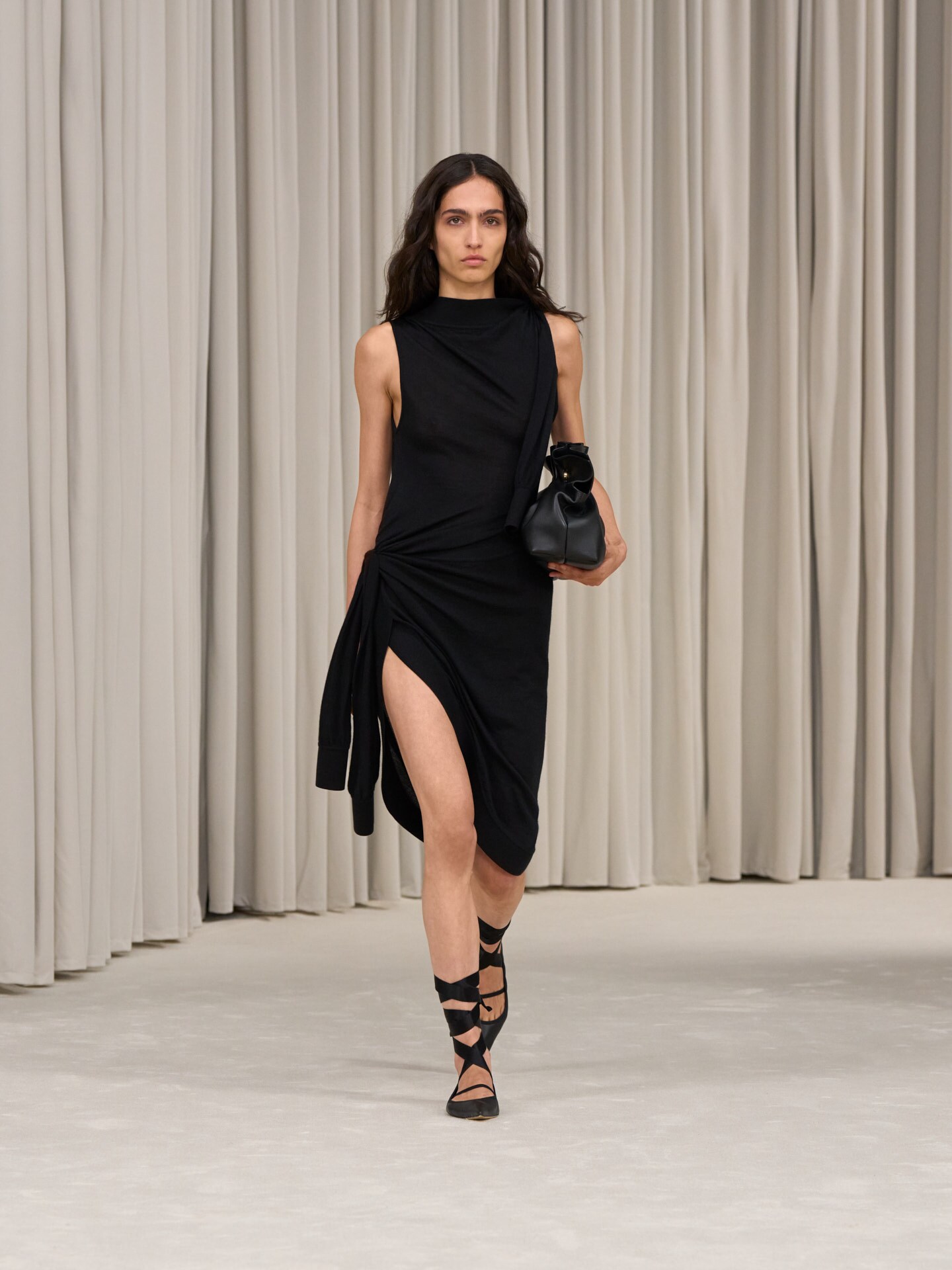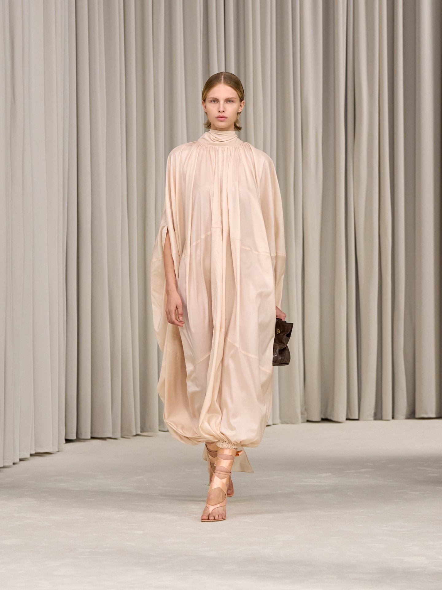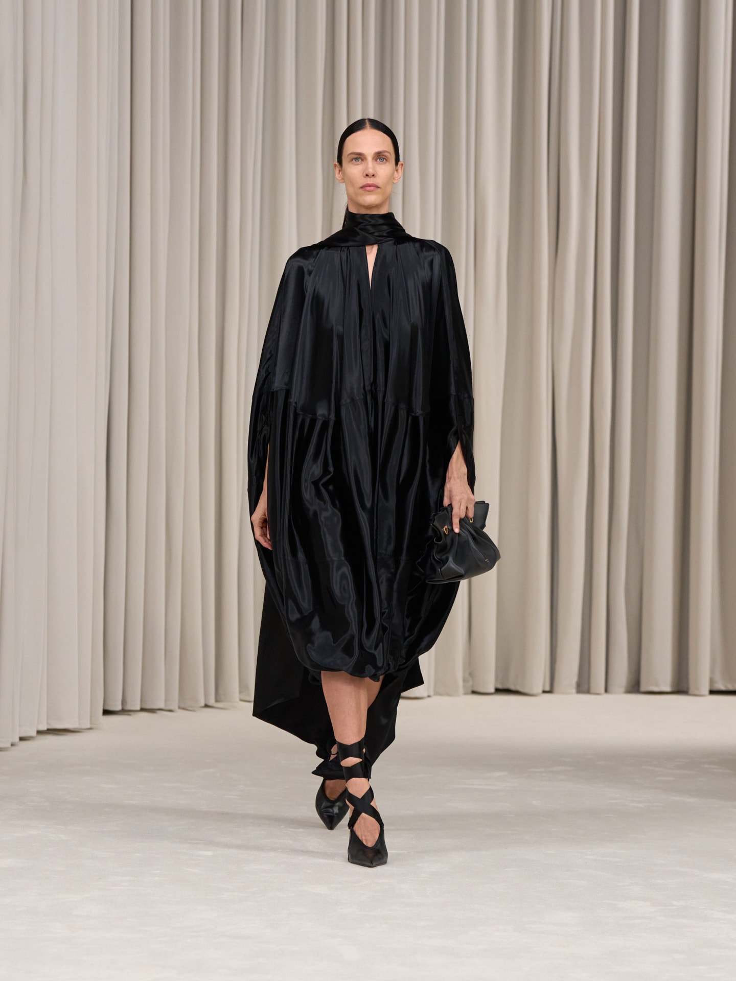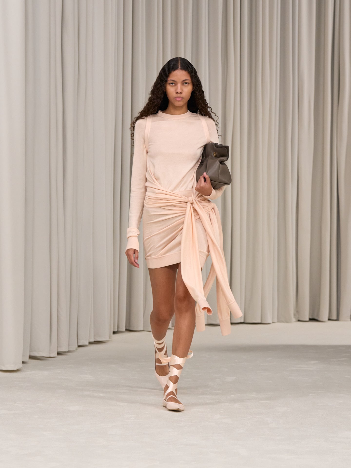 En la colección Primavera/Verano 2025, Maximilian Davis explora la conexión entre Ferragamo y el mundo del ballet. Las prendas de ensayo inspiran las piezas de cachemir y algodón de segunda piel, superpuestas, retorcidas y anudadas. La libertad de movimiento se refleja en siluetas amplificadas, como los abrigos de ópera y los vestidos paracaídas de nailon de seda, ante y organza, y también en los monos técnicos y los cortes de sastrería oversize. Los vestidos bordados con lentejuelas rinden homenaje al glamour de Katherine Dunham, icónica bailarina, coreógrafa y antropóloga, para quien Salvatore Ferragamo diseñó zapatos a medida en Florencia en 1950.