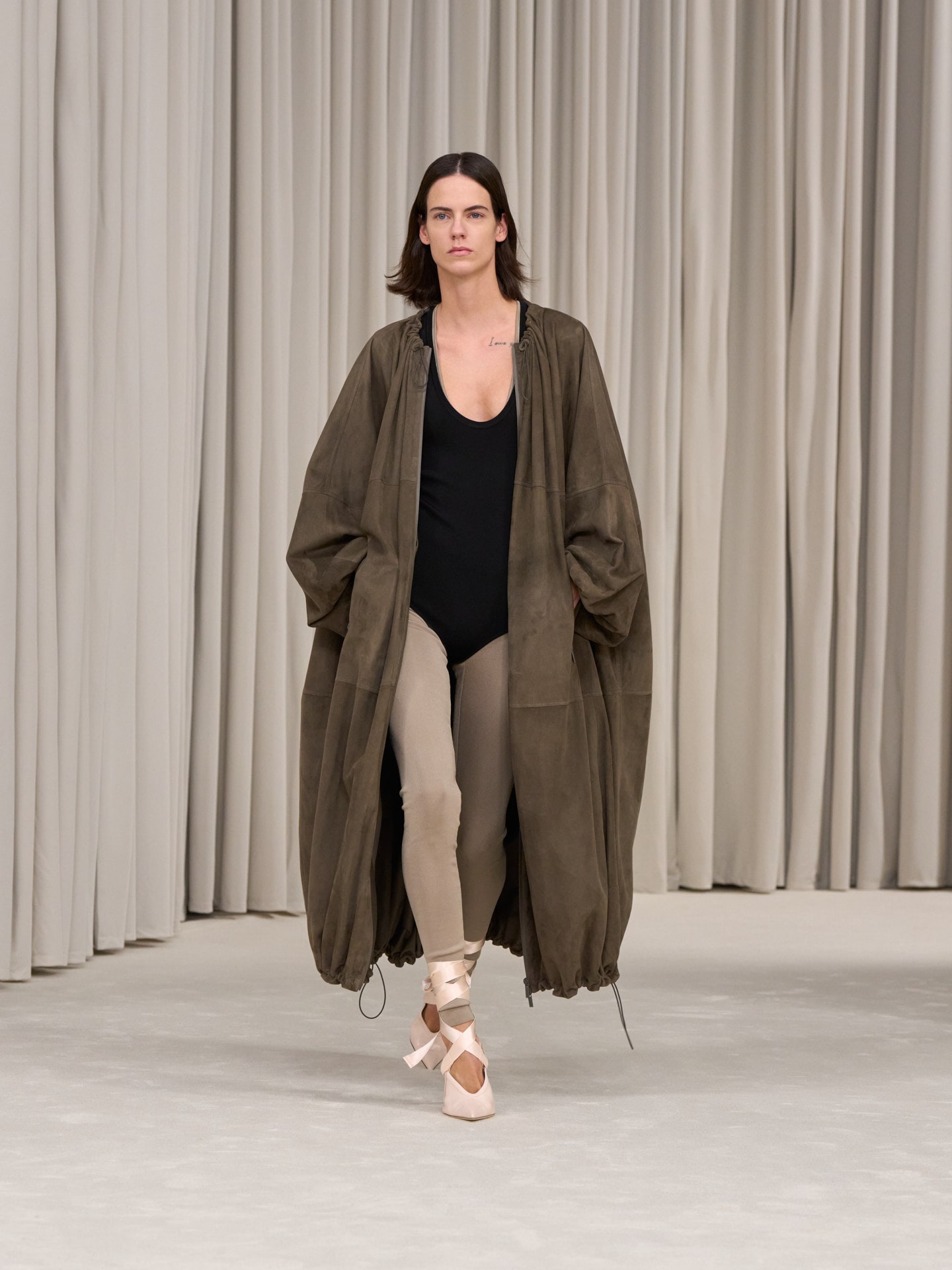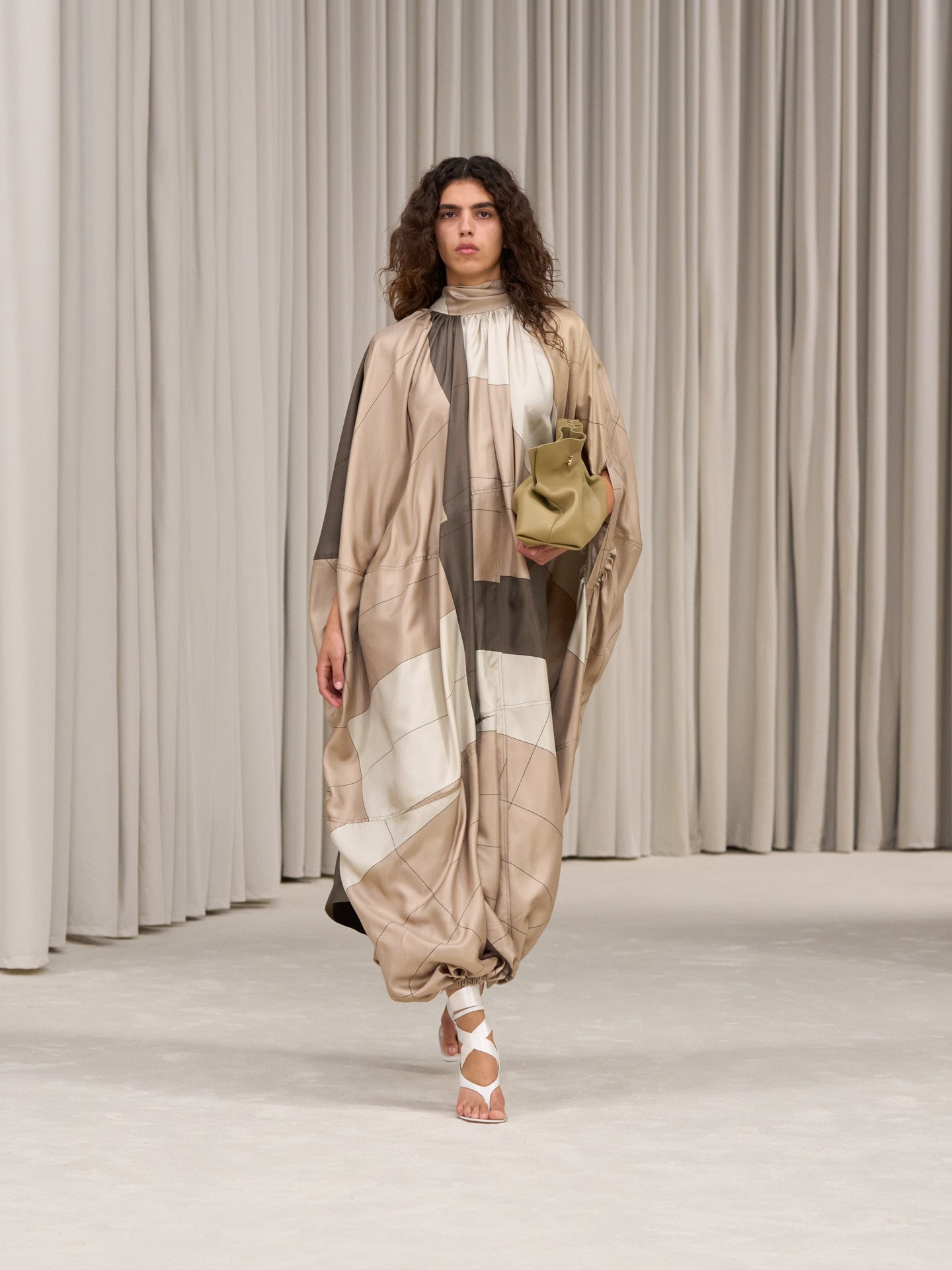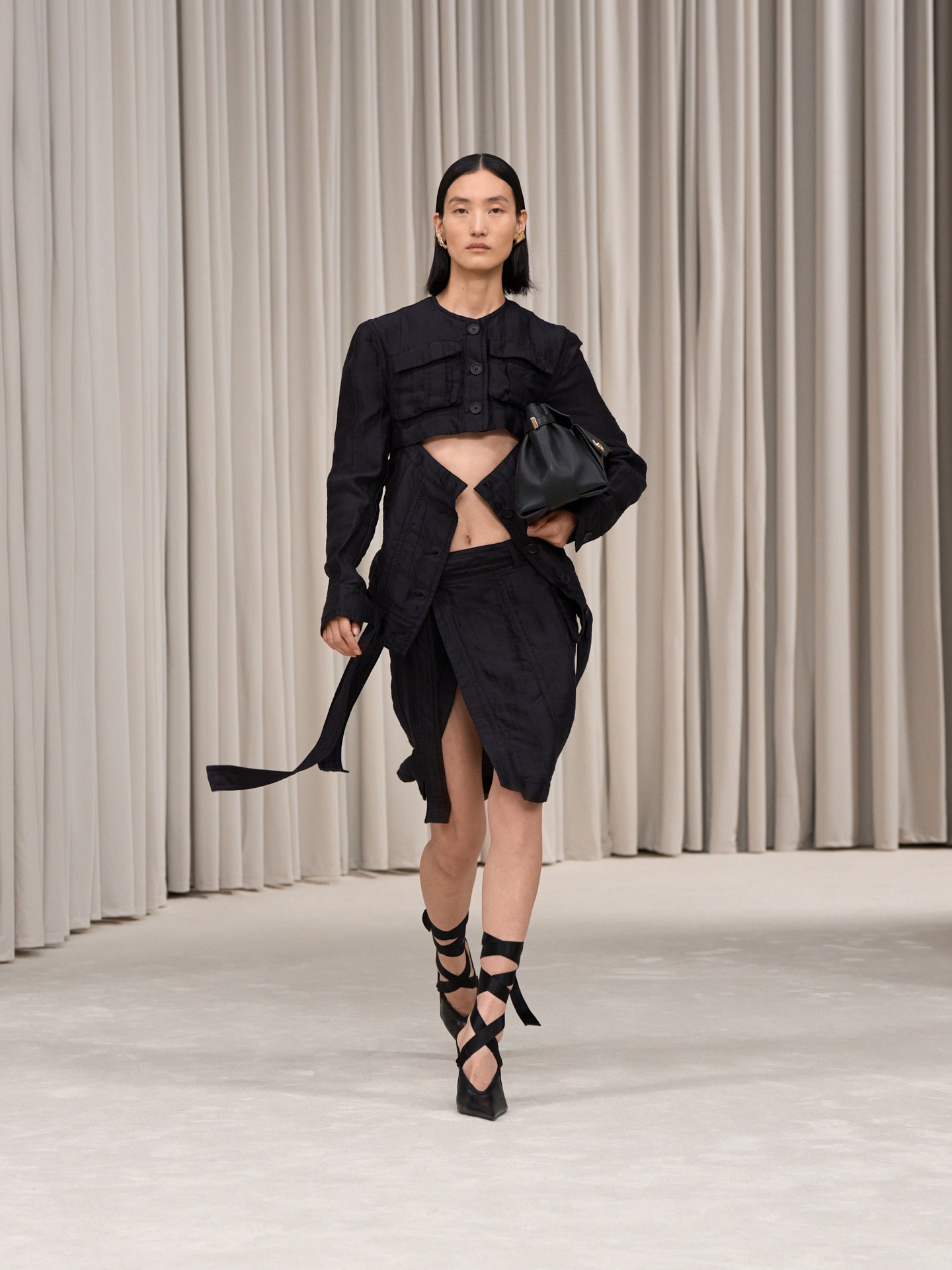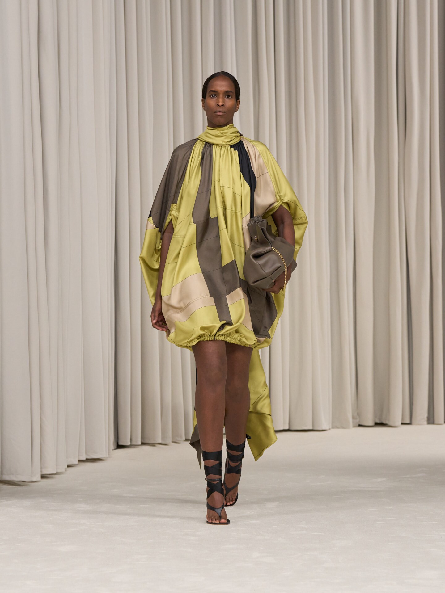 En la colección Primavera/Verano 2025, Maximilian Davis explora la conexión entre Ferragamo y el mundo del ballet. Las prendas de ensayo inspiran las piezas de cachemir y algodón de segunda piel, superpuestas, retorcidas y anudadas. La libertad de movimiento se refleja en siluetas amplificadas, como los abrigos de ópera y los vestidos paracaídas de nailon de seda, ante y organza, y también en los monos técnicos y los cortes de sastrería oversize. Los vestidos bordados con lentejuelas rinden homenaje al glamour de Katherine Dunham, icónica bailarina, coreógrafa y antropóloga, para quien Salvatore Ferragamo diseñó zapatos a medida en Florencia en 1950.
