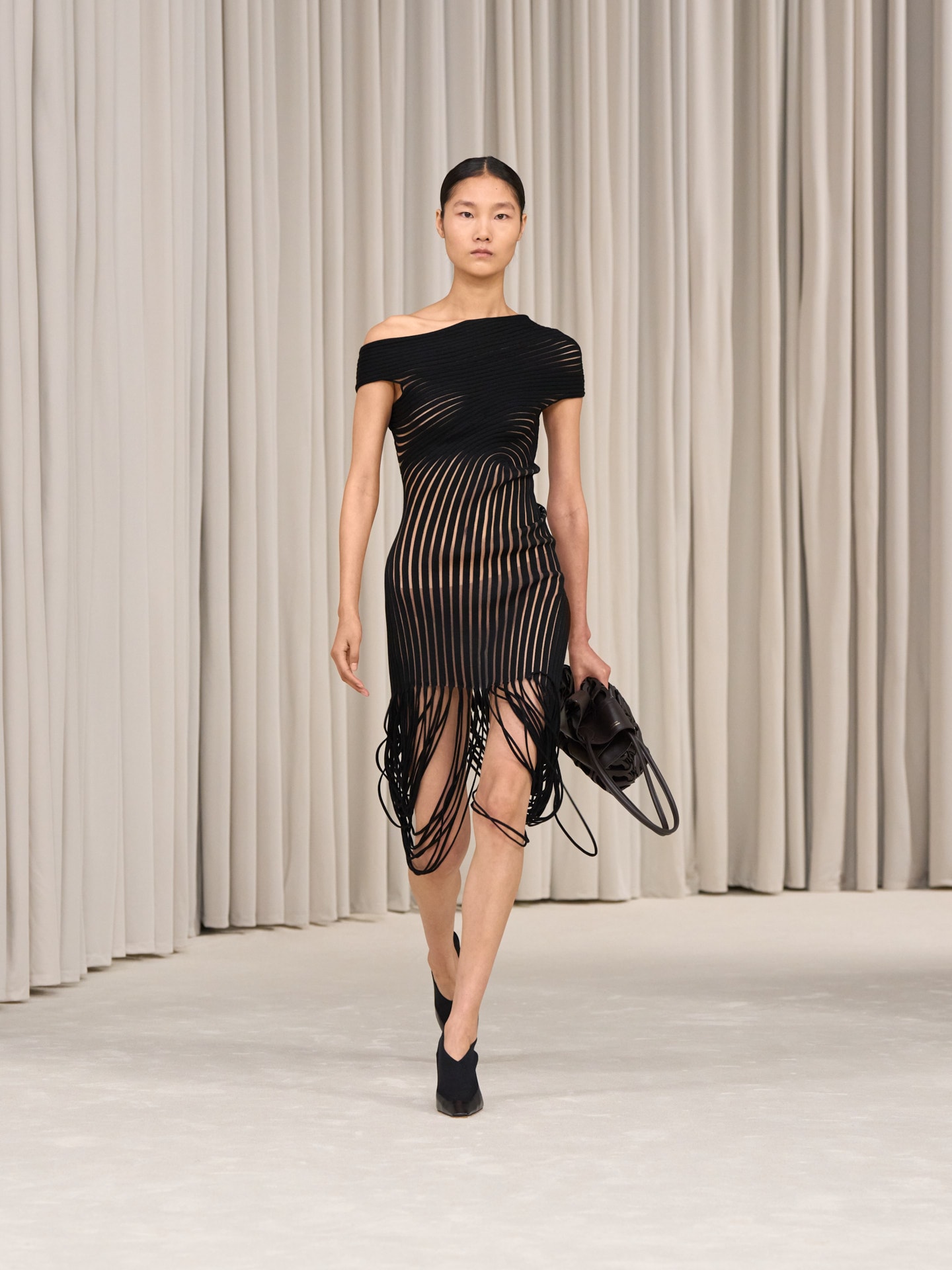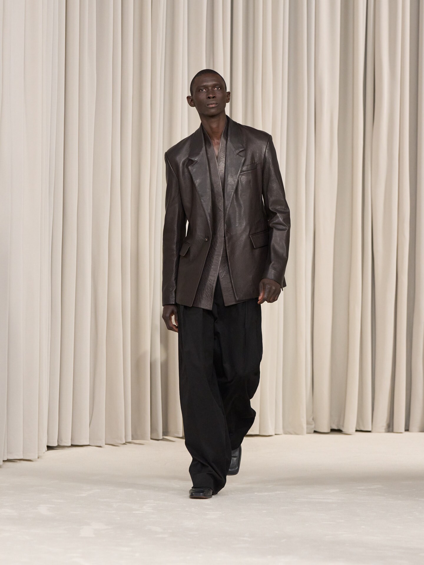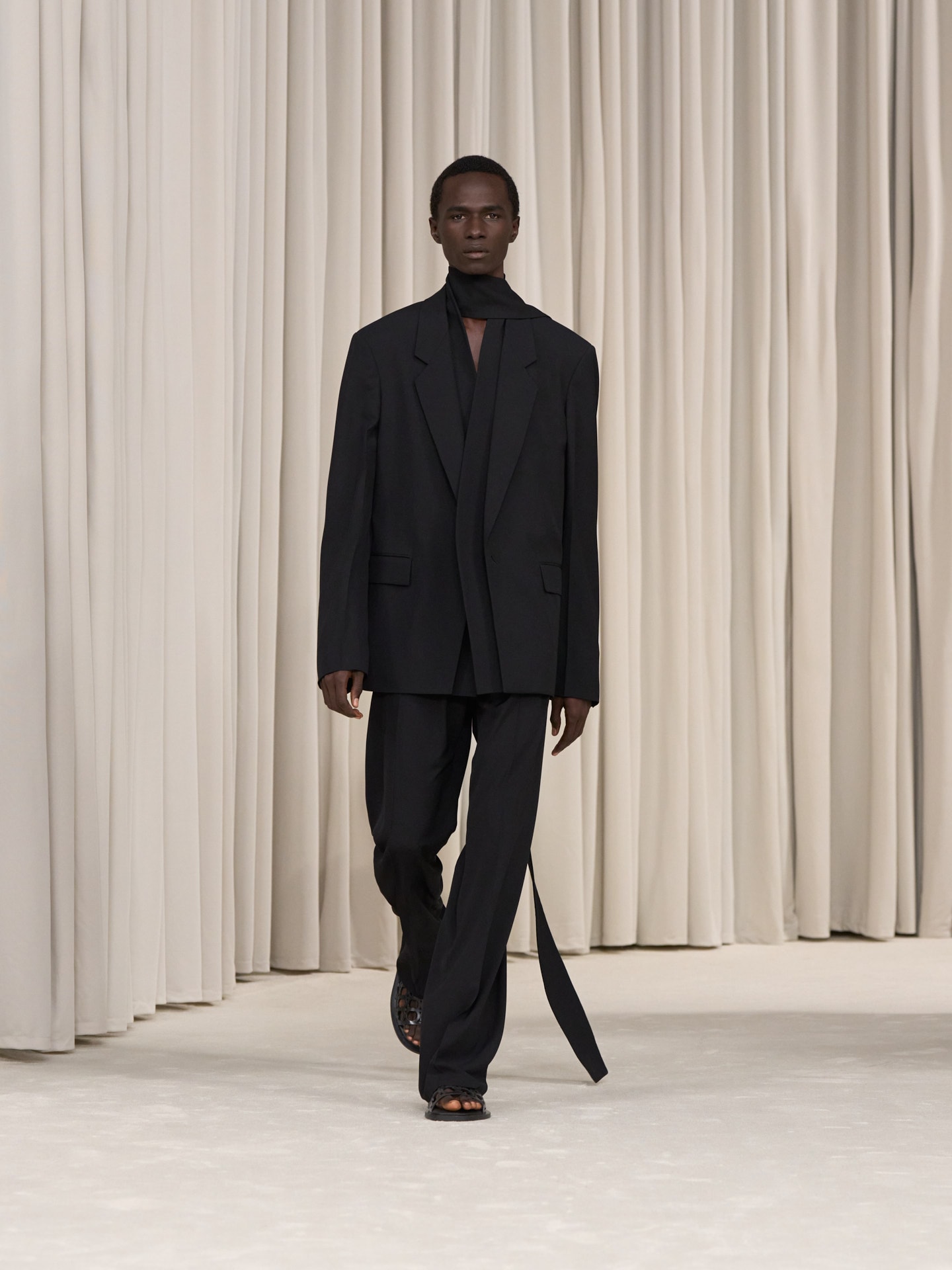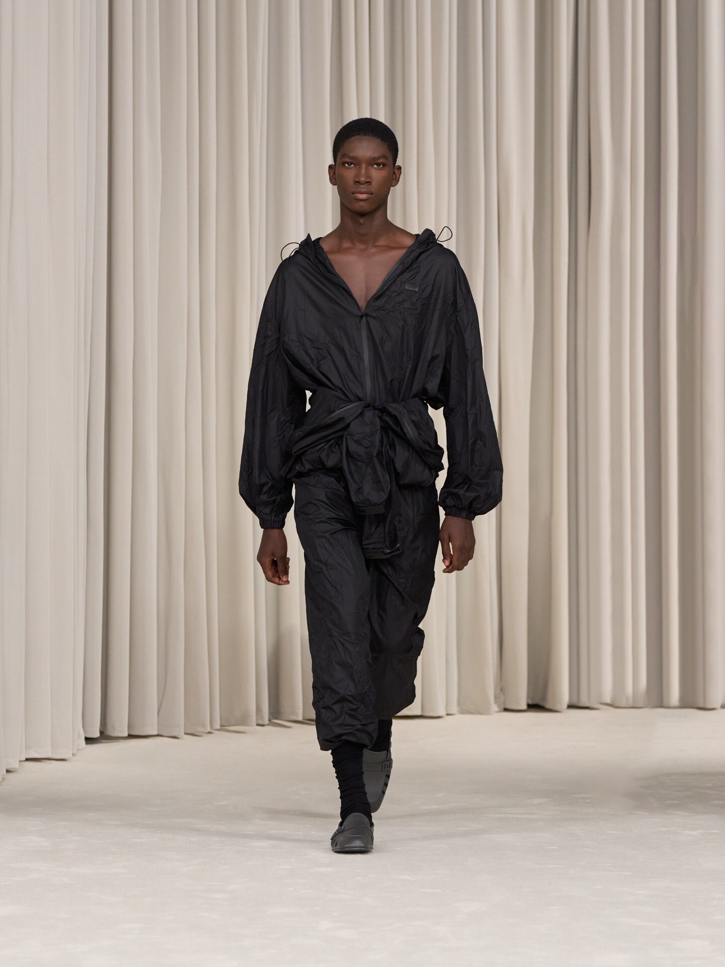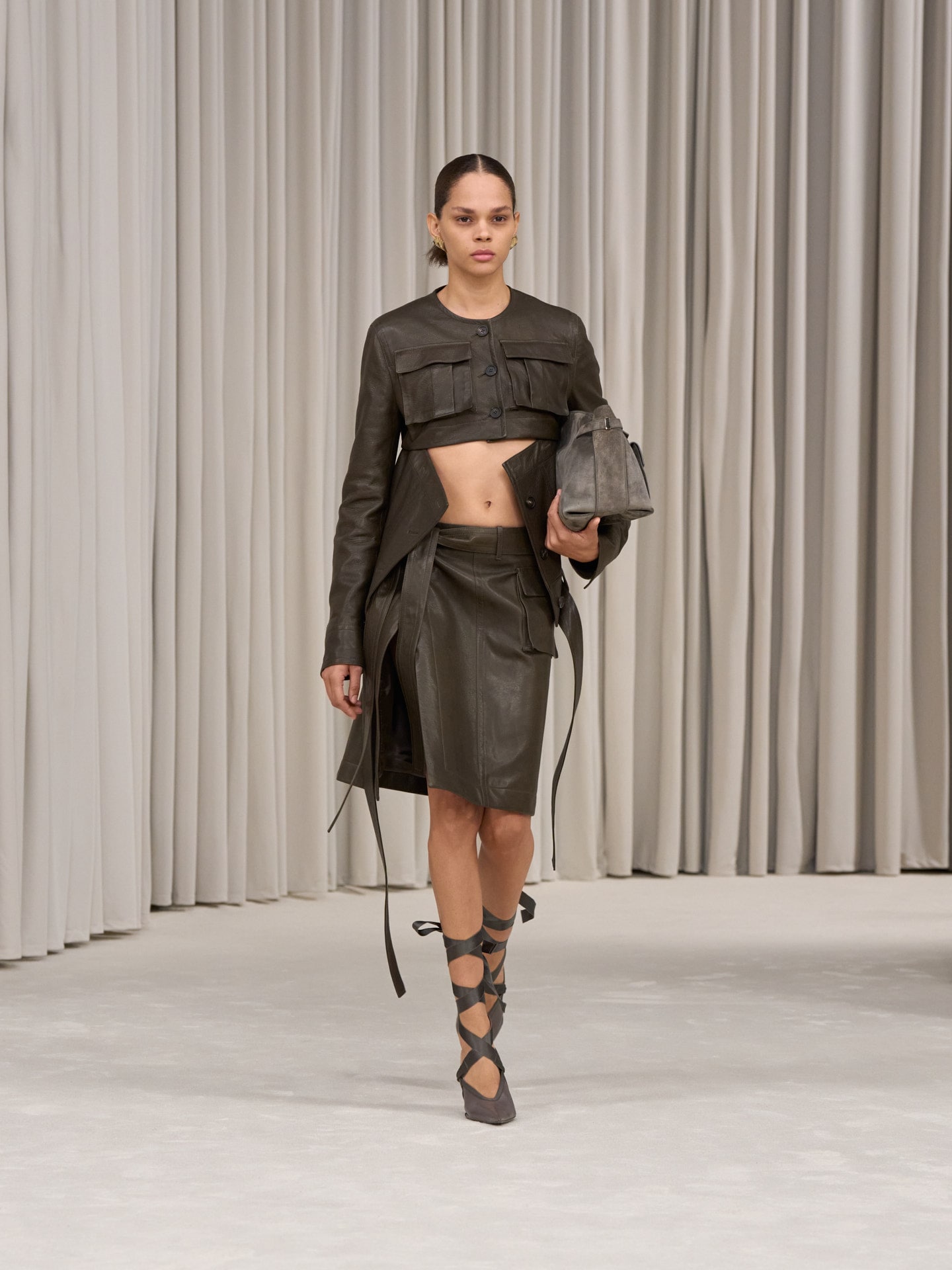 En la colección Primavera/Verano 2025, Maximilian Davis explora la conexión entre Ferragamo y el mundo del ballet. Las prendas de ensayo inspiran las piezas de cachemir y algodón de segunda piel, superpuestas, retorcidas y anudadas. La libertad de movimiento se refleja en siluetas amplificadas, como los abrigos de ópera y los vestidos paracaídas de nailon de seda, ante y organza, y también en los monos técnicos y los cortes de sastrería oversize. Los vestidos bordados con lentejuelas rinden homenaje al glamour de Katherine Dunham, icónica bailarina, coreógrafa y antropóloga, para quien Salvatore Ferragamo diseñó zapatos a medida en Florencia en 1950.