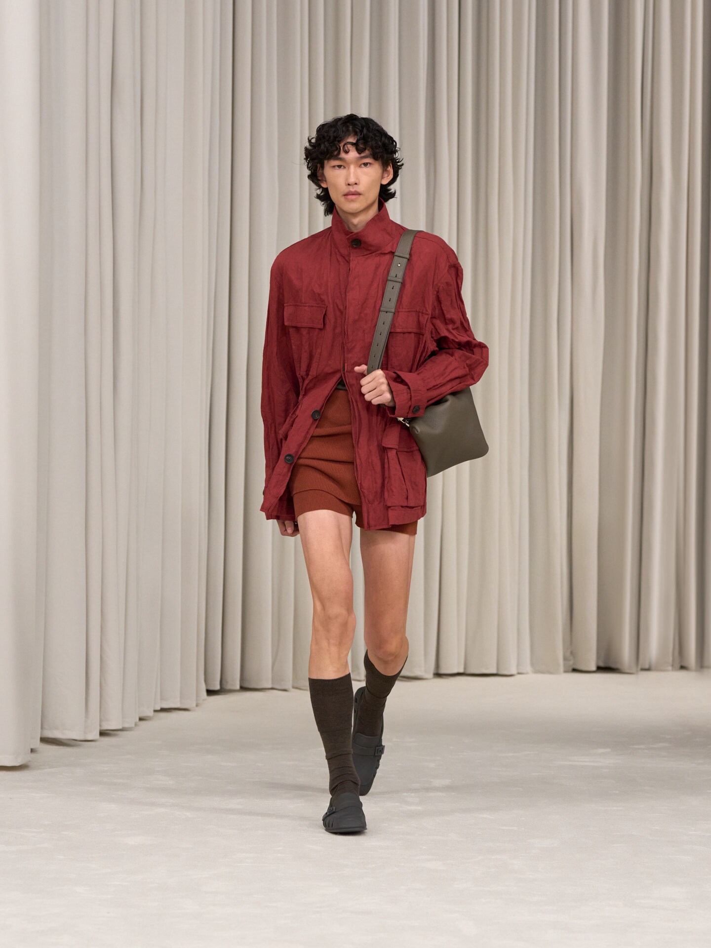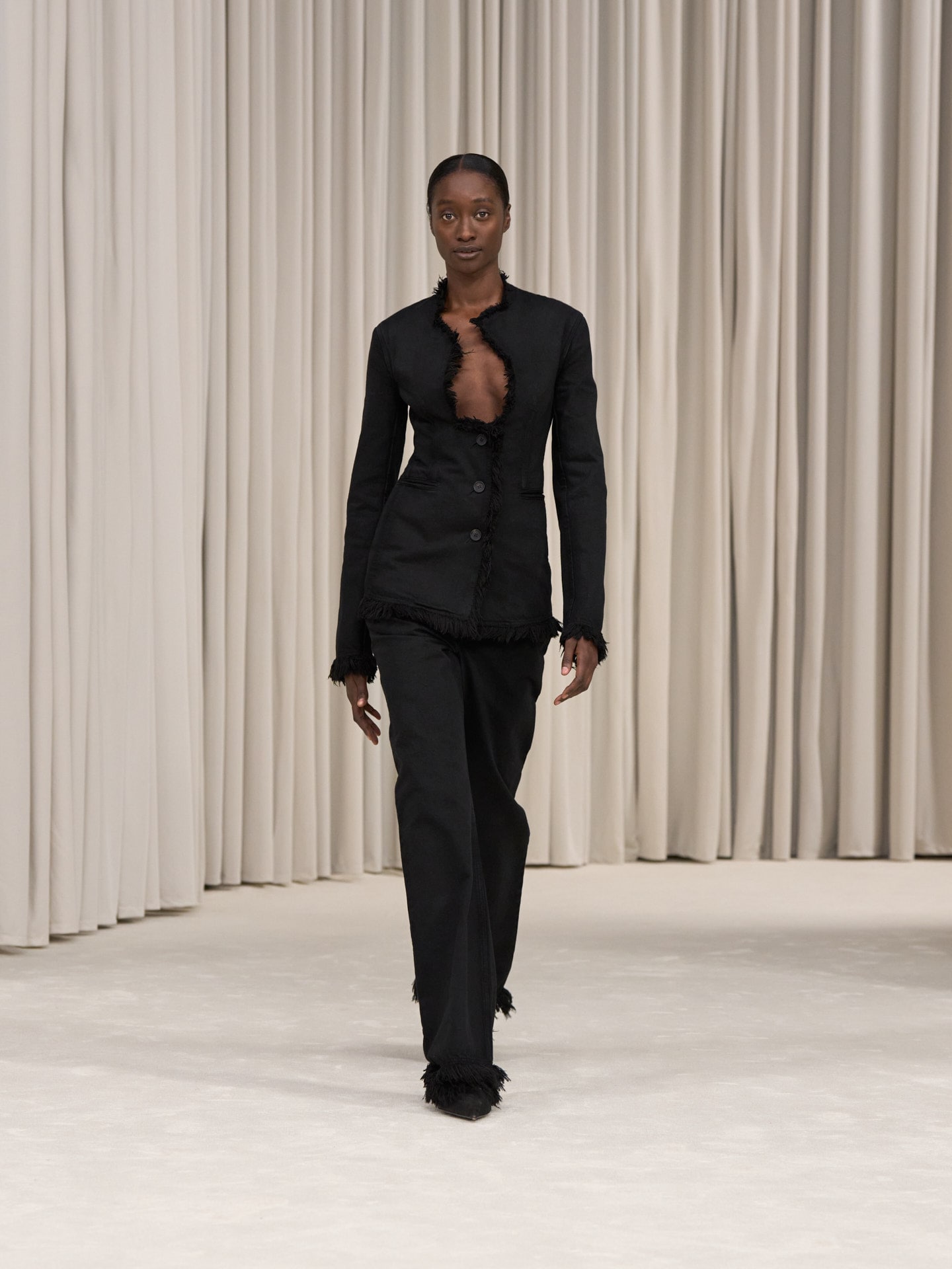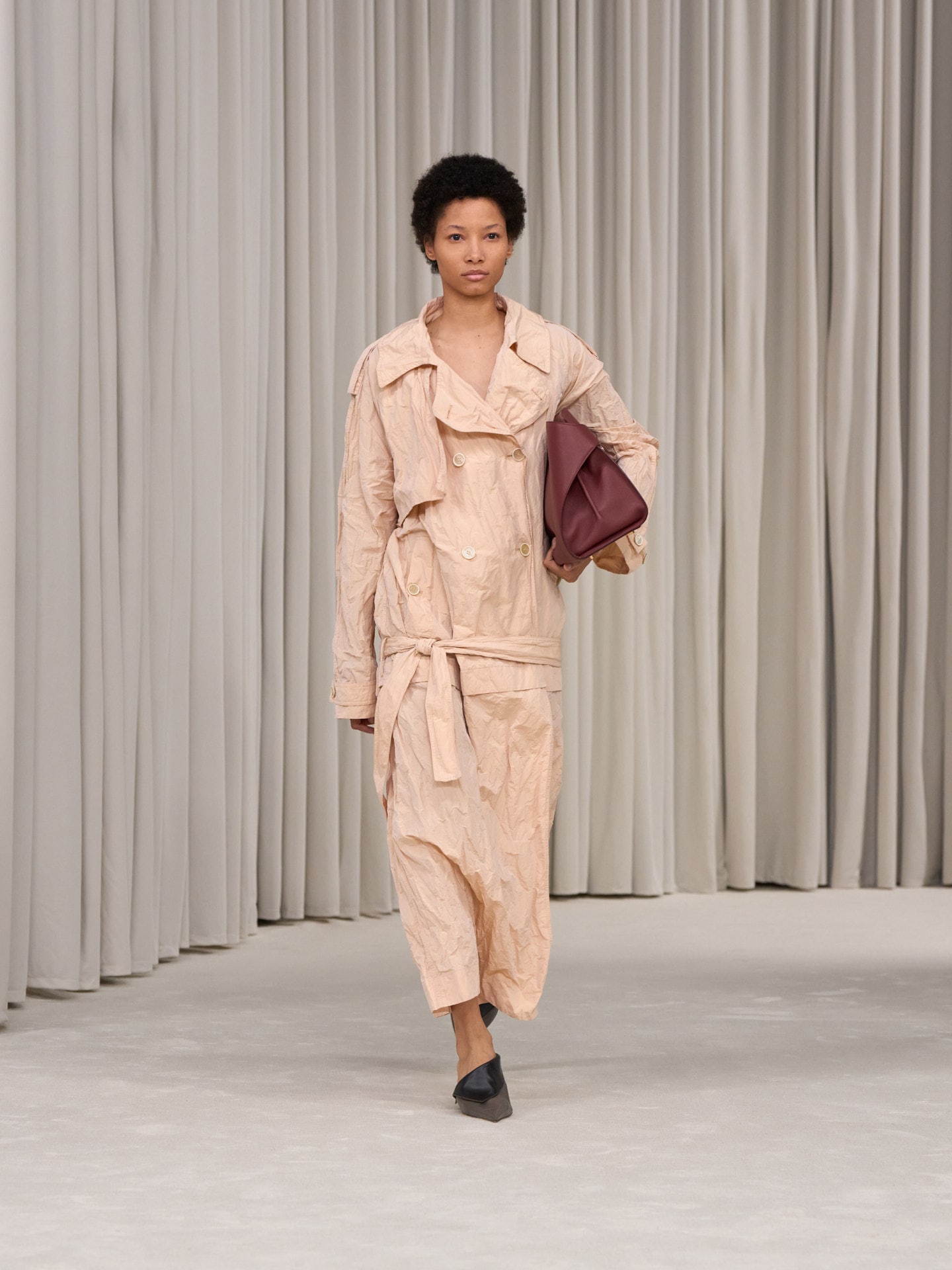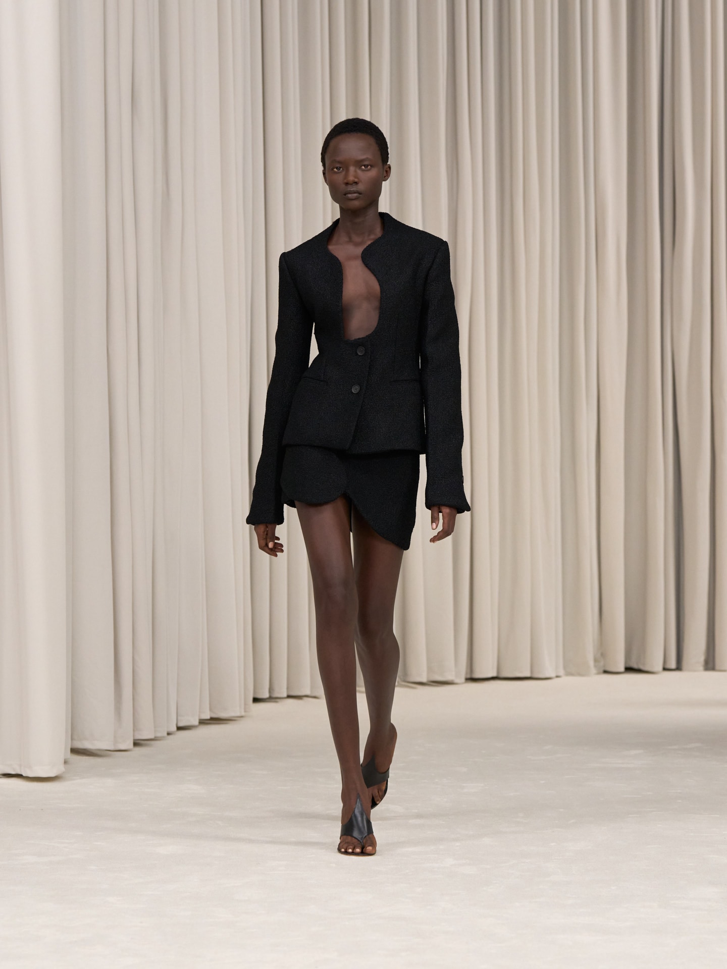 En la colección Primavera/Verano 2025, Maximilian Davis explora la conexión entre Ferragamo y el mundo del ballet. Las prendas de ensayo inspiran las piezas de cachemir y algodón de segunda piel, superpuestas, retorcidas y anudadas. La libertad de movimiento se refleja en siluetas amplificadas, como los abrigos de ópera y los vestidos paracaídas de nailon de seda, ante y organza, y también en los monos técnicos y los cortes de sastrería oversize. Los vestidos bordados con lentejuelas rinden homenaje al glamour de Katherine Dunham, icónica bailarina, coreógrafa y antropóloga, para quien Salvatore Ferragamo diseñó zapatos a medida en Florencia en 1950.