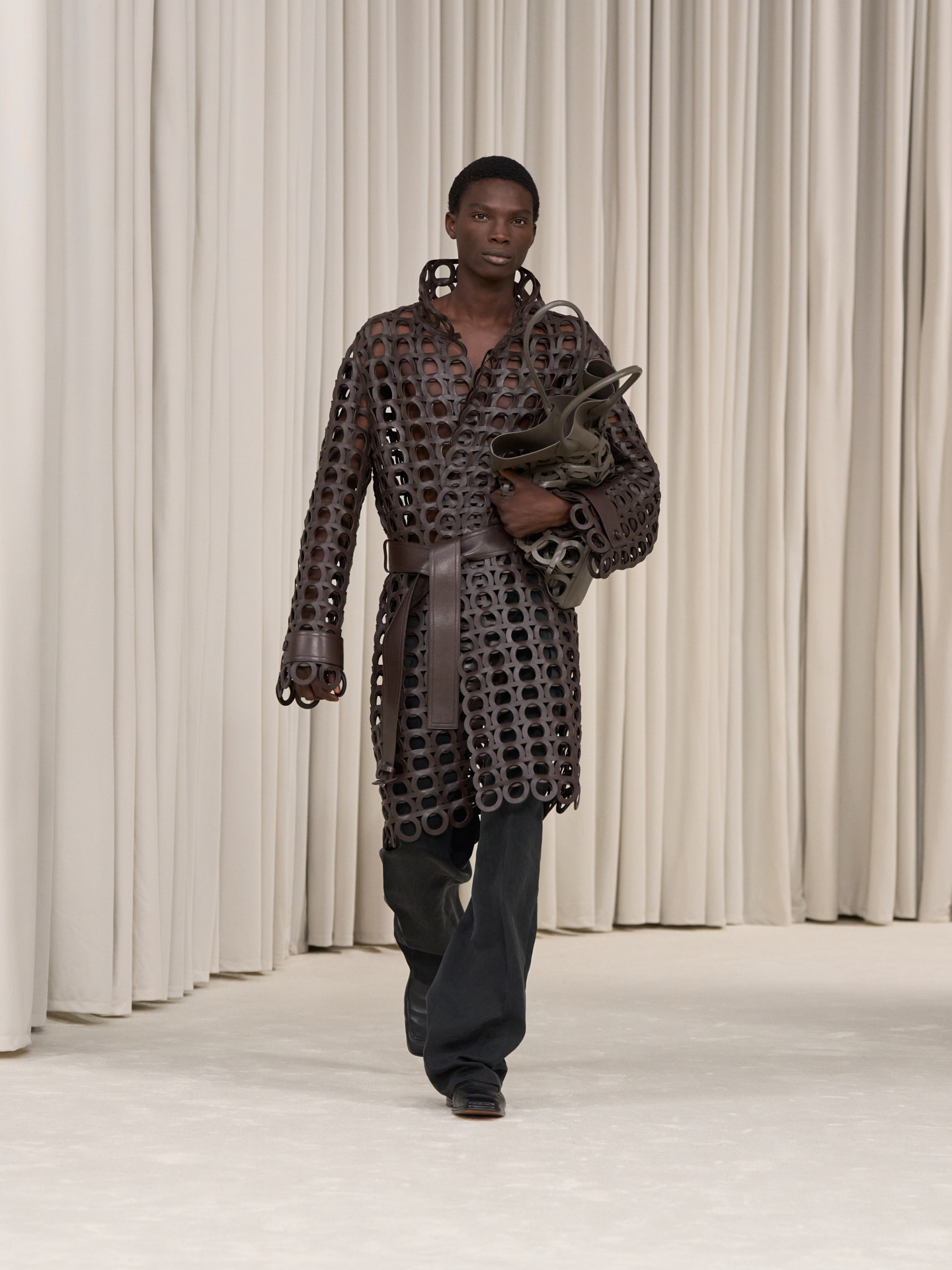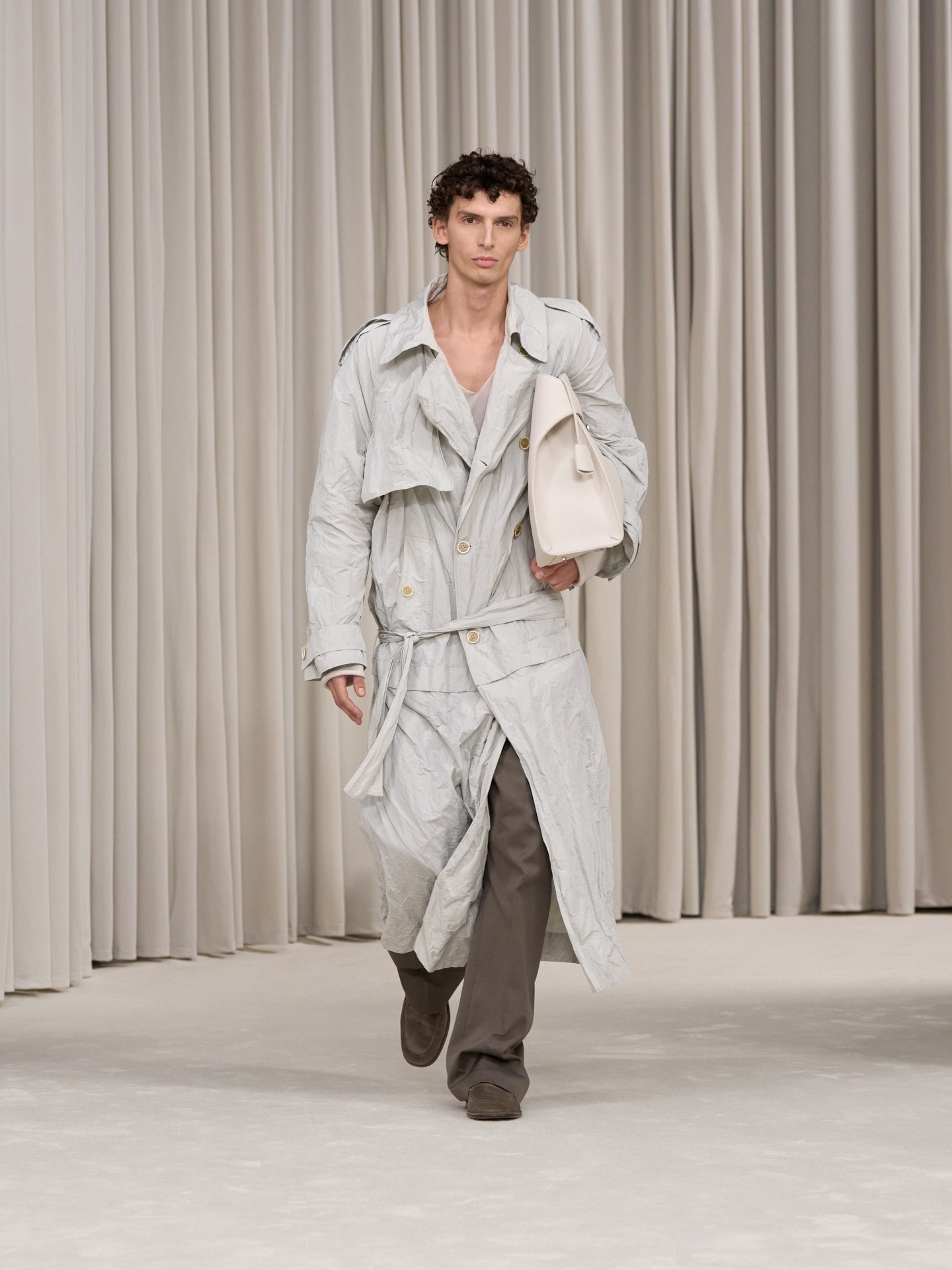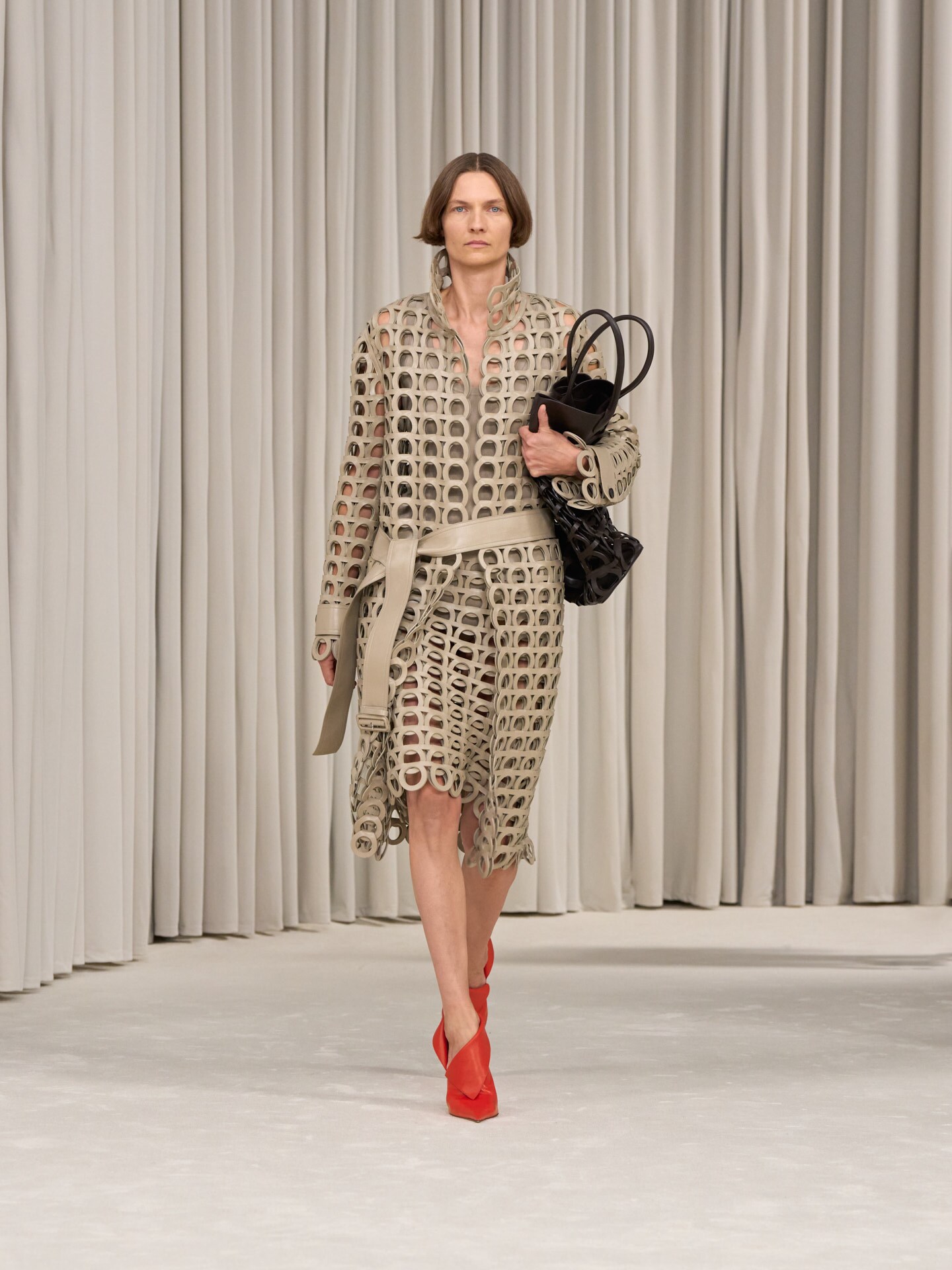 Zapatos de salón y sandalias atadas con cintas de seda hasta la pantorrilla se combinan con botines geométricos, una evolución de un estilo de archivo de los años 40. Un nuevo bolso sobredimensionado, de cuero flexible y suave, se desploma suavemente sobre sí mismo, con el cuero perforado por un Gancini metálico. El icónico bolso Hug se suaviza y se reconstruye, con una sola asa y cuero flexible, o como clutch.